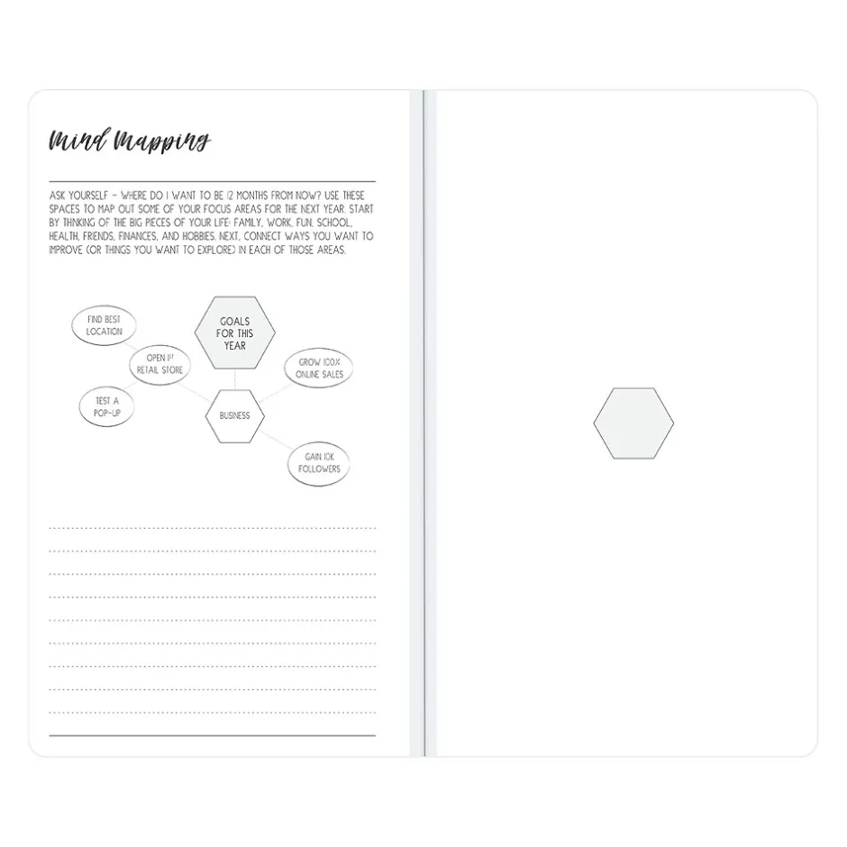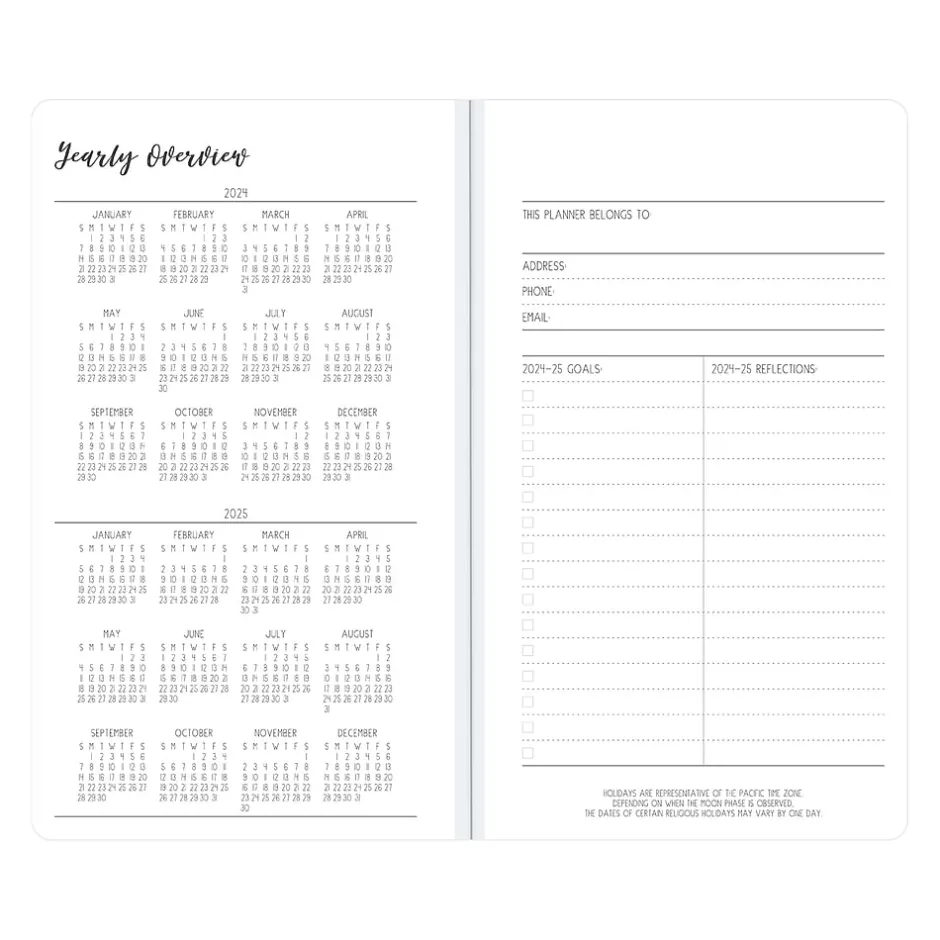 - Includes pages for your goals, contacts, and important dates