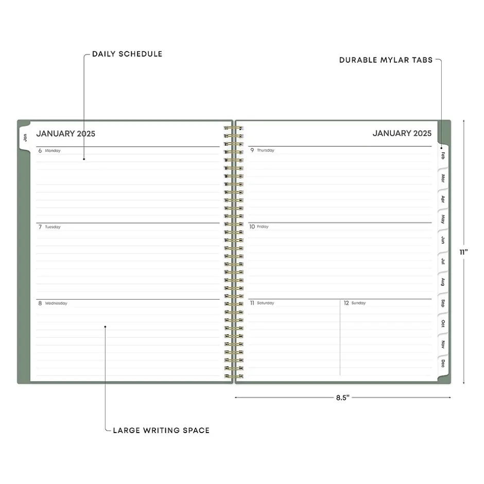 - Weekly and monthly planner covers 12 months from January 2025 to December 2025