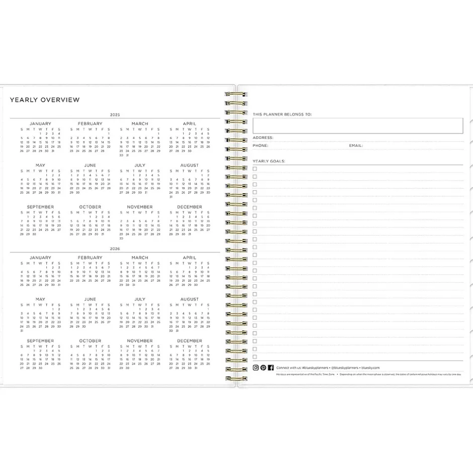 - Yearly overview, list of major holidays, and pages for your contacts, goals, important dates, and notes