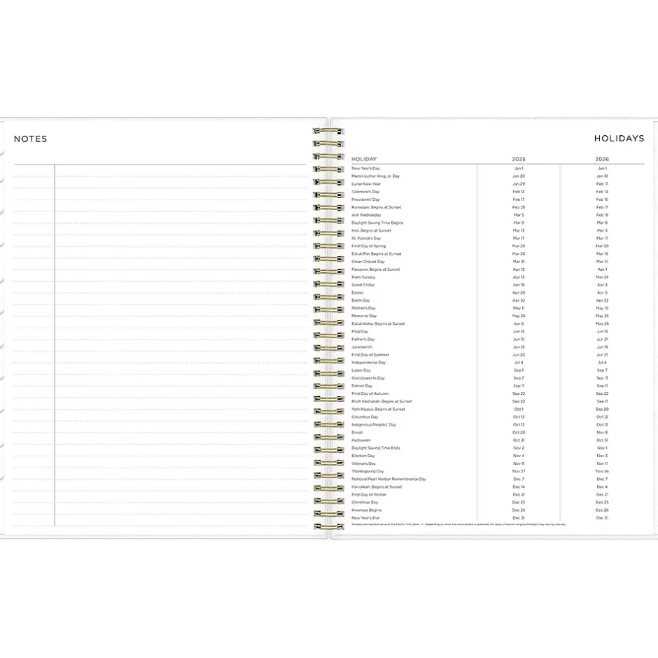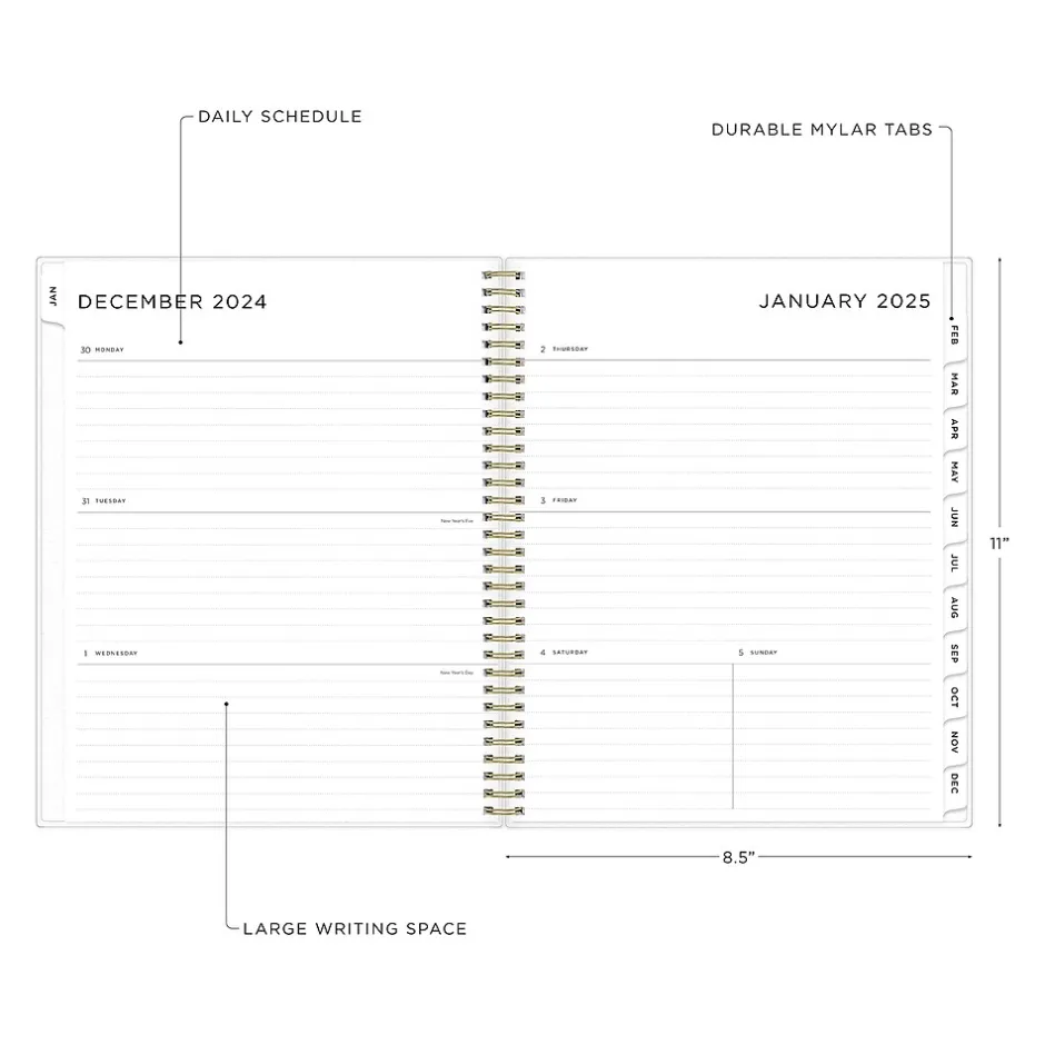 - Features two-page weekly and monthly spreads, with space for notes and quick reference calendars