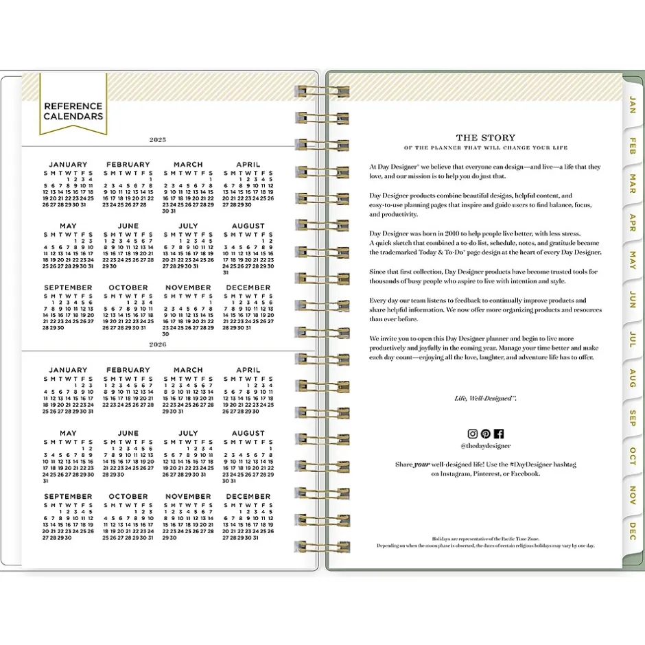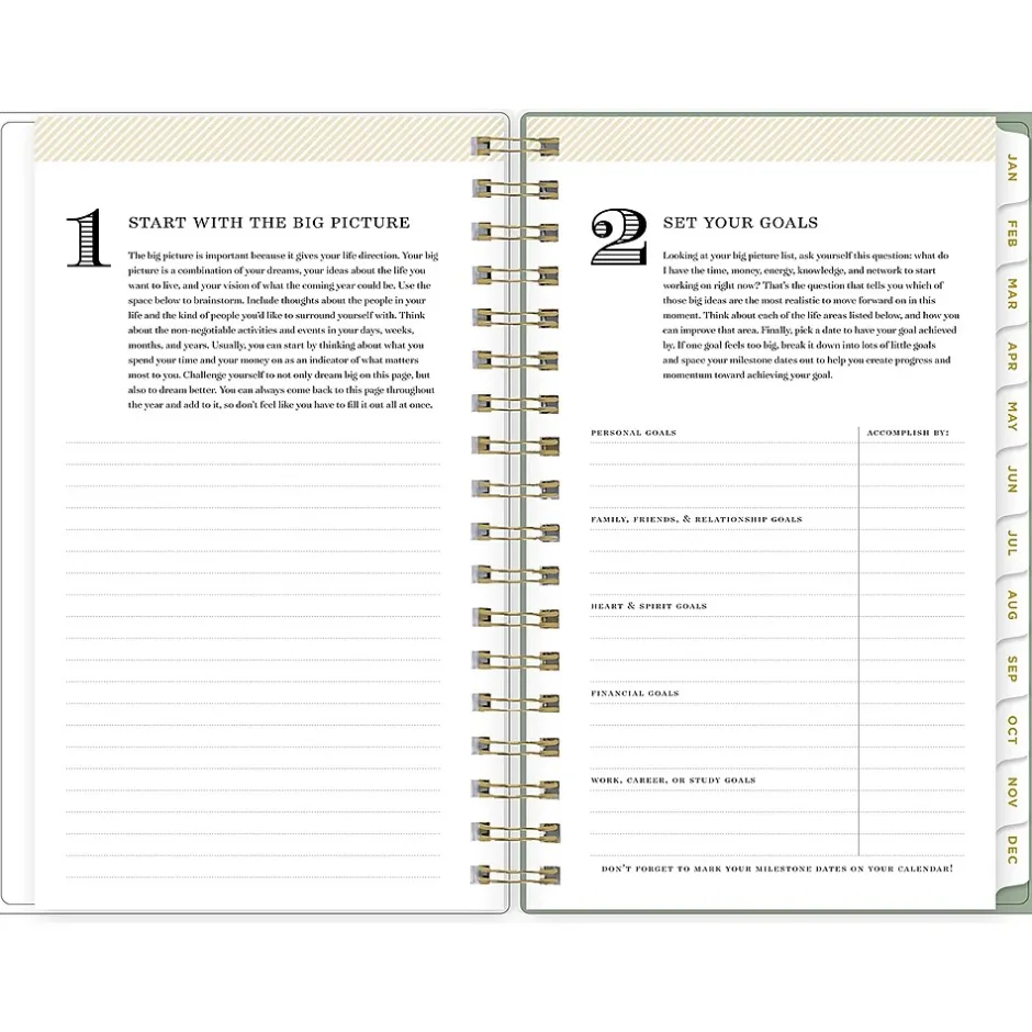 - Yearly overview, list of major holidays, and pages for your contacts, goals, important dates, and notes