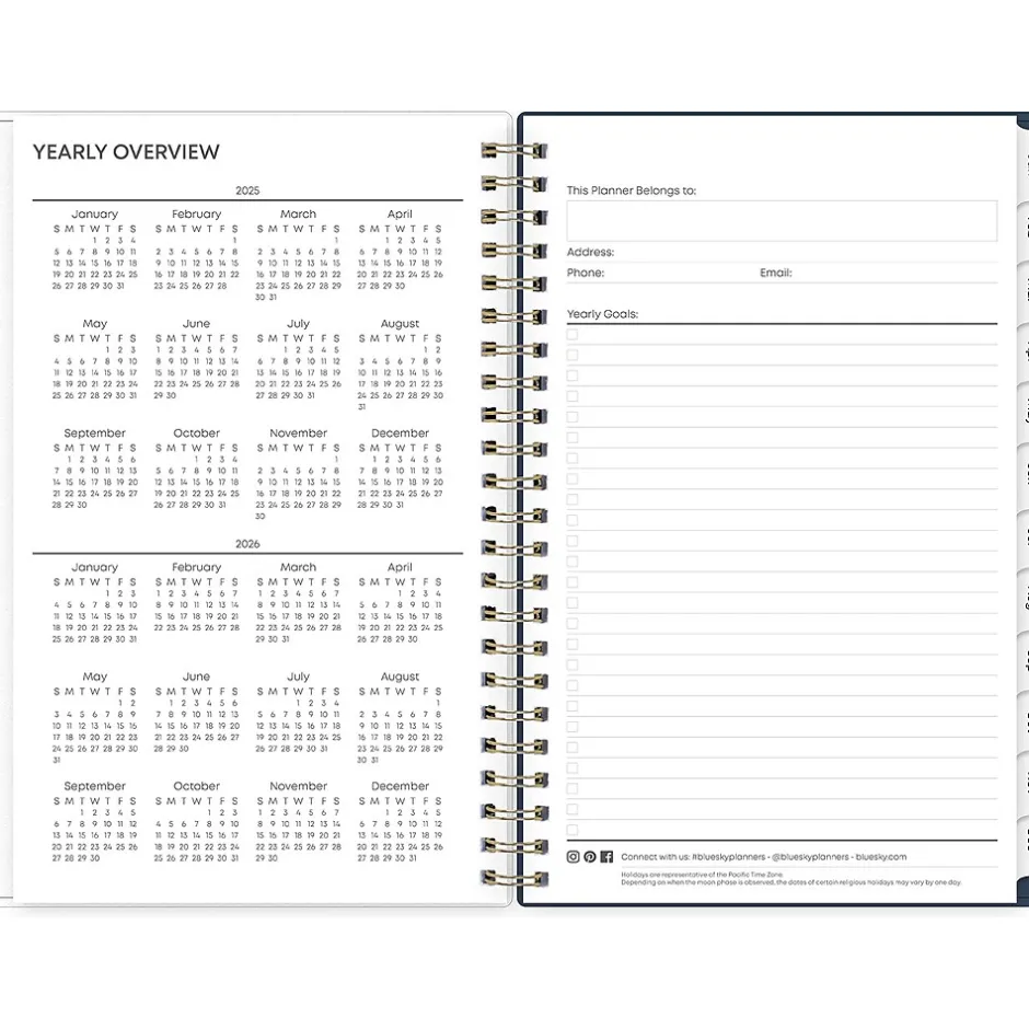- Yearly overview, list of major holidays, and pages for your contacts, goals, important dates, and notes