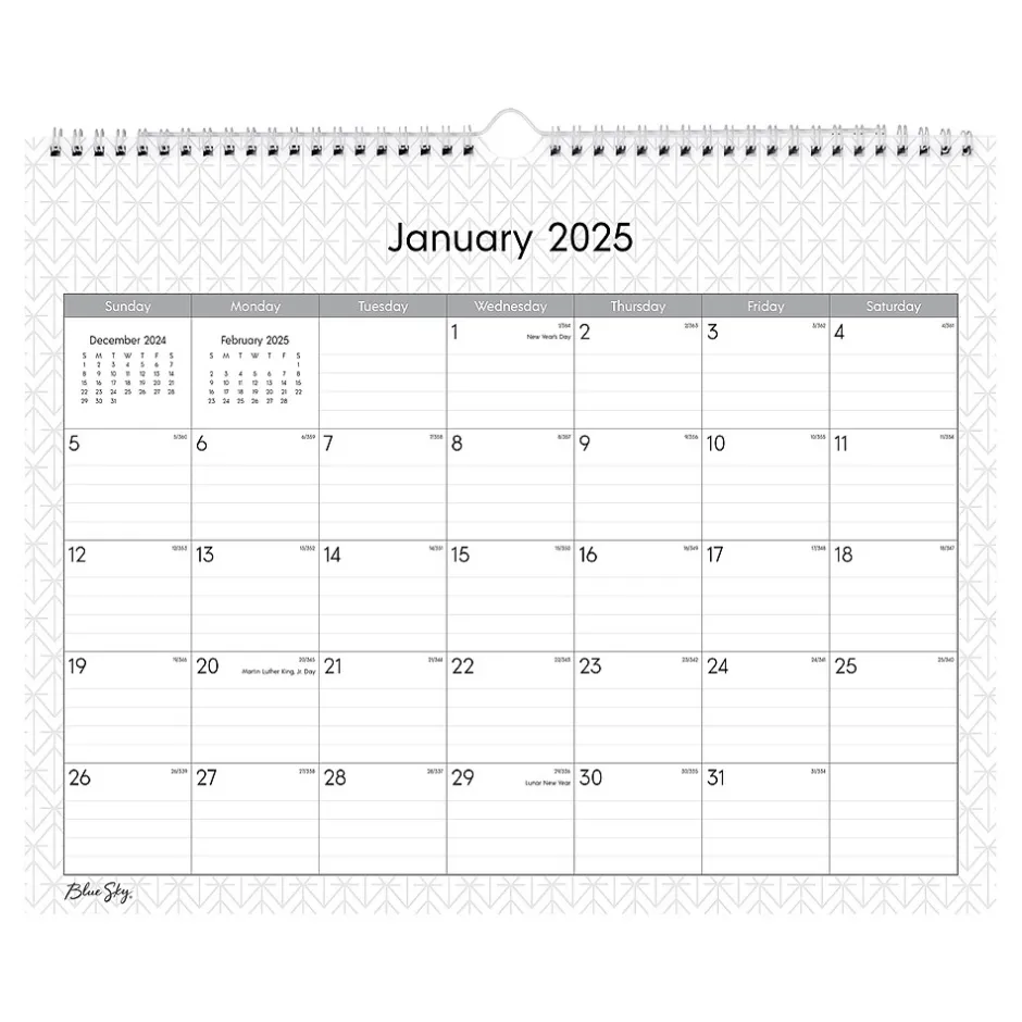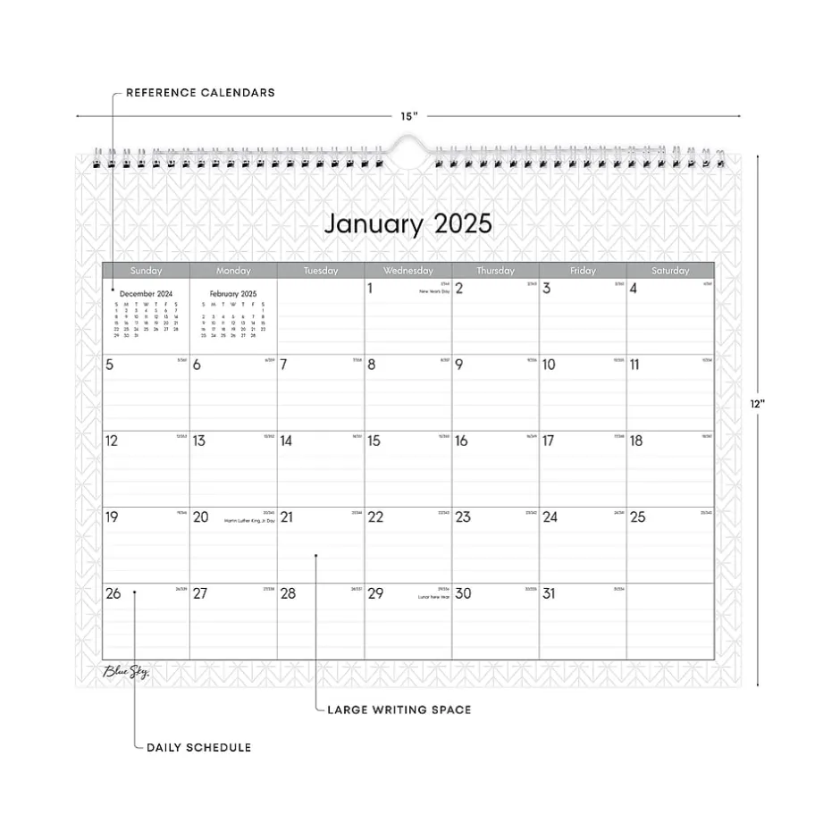 Made for 2025, the Blue Sky Enterprise wall calendar accentuates any room. Easy to read with a large font, this calendar is a perfect tool to track deadlines and birthdays. Enjoy high-quality white paper, large text, and hassle-free hanging with a sturdy hook.