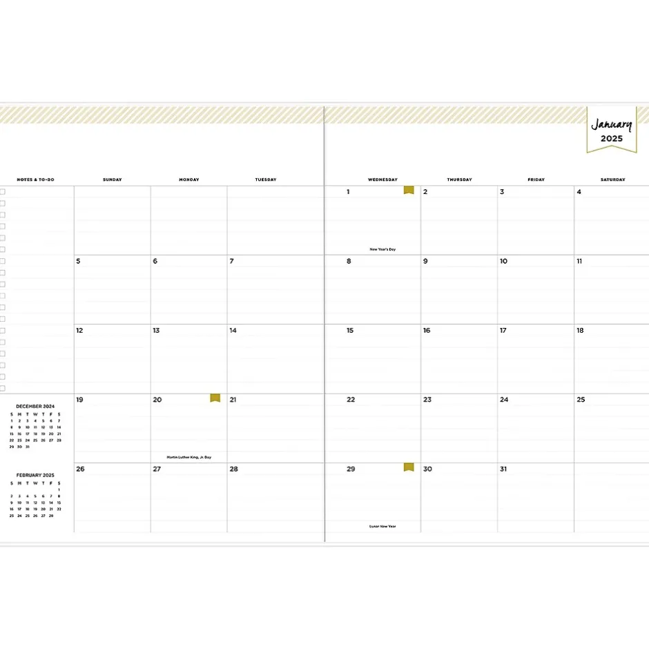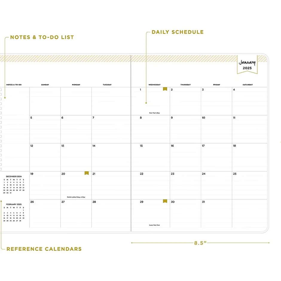 - Features two-page non-tabbed monthly spreads, with space for notes and quick reference calendars