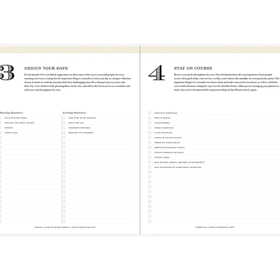 - Yearly overview, list of major holidays, and pages for your contacts, goals, important dates, and notes