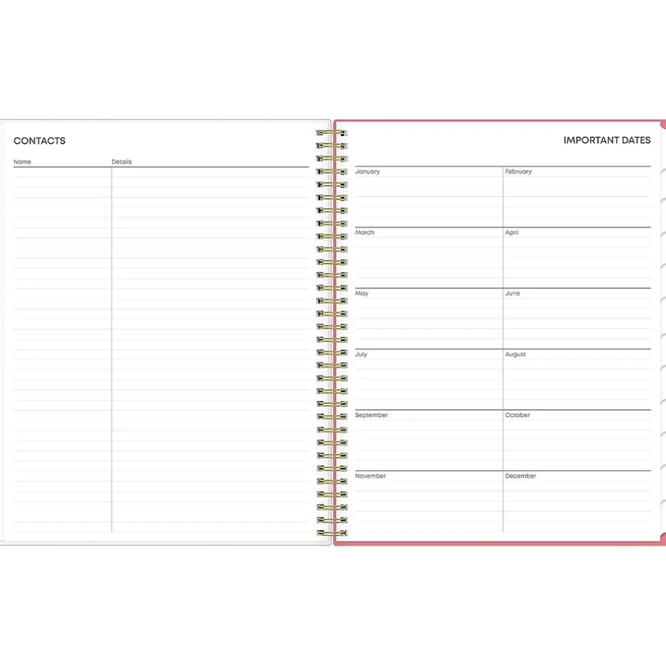 - Offers one week per two pages and one month per two pages, with space for notes and quick reference calendars