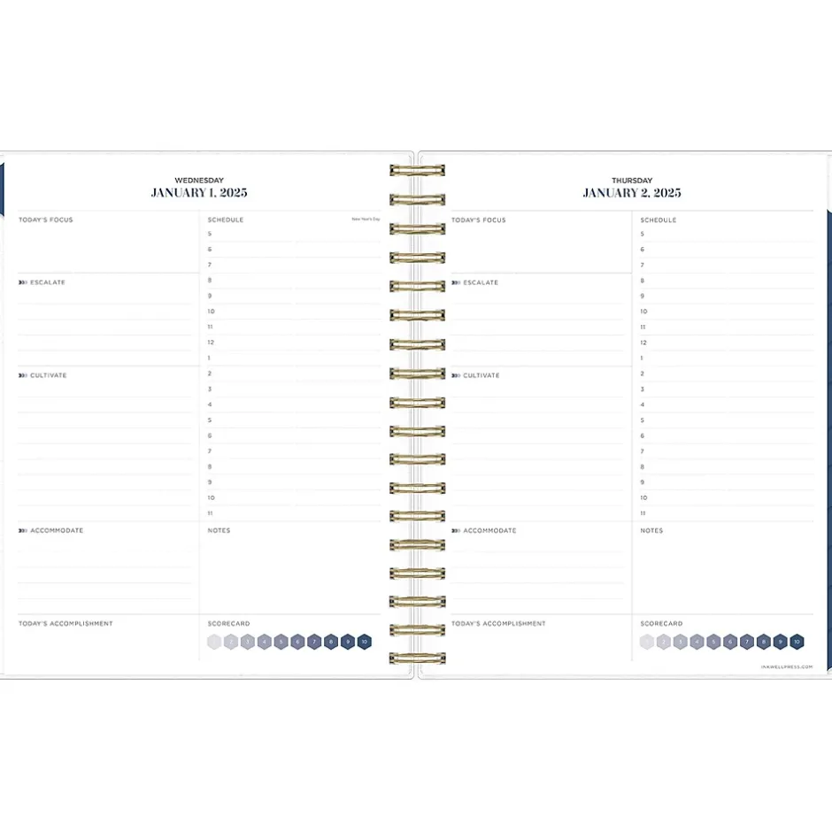- One pay per day with hourly planning and sections for notes and priorities; two-page monthly views with space for notes, top five priorities, and next month reference calendar