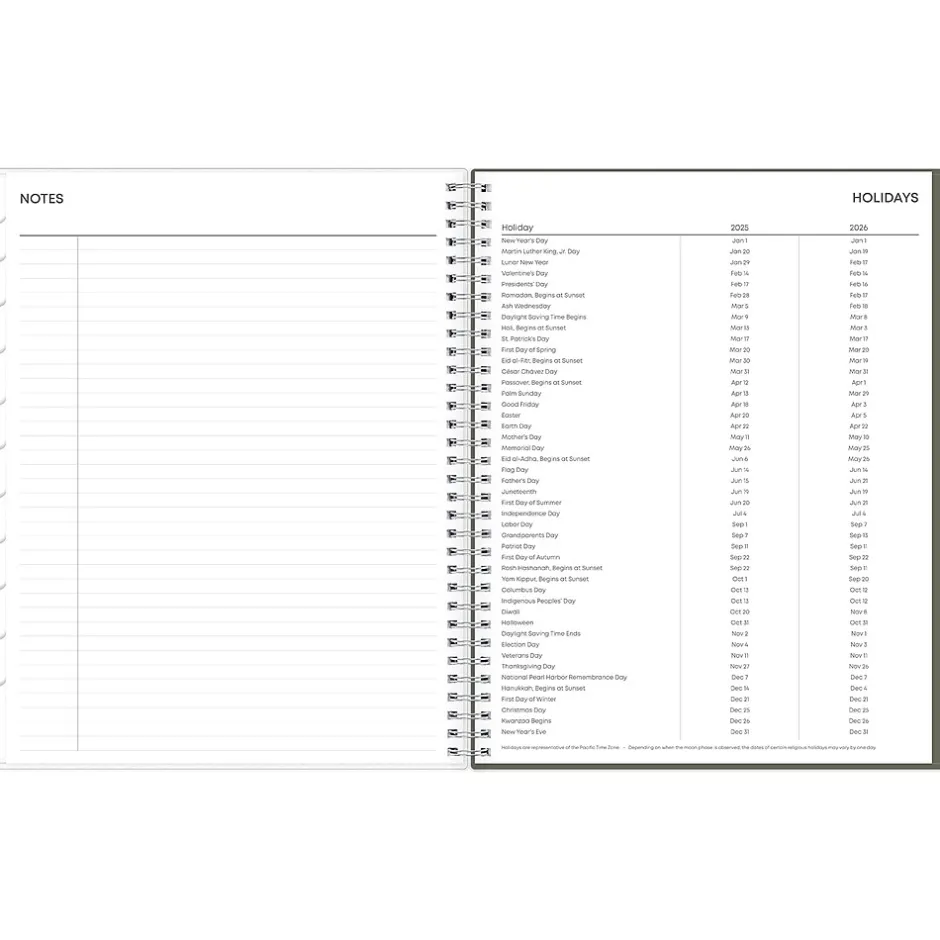 - Yearly overview, list of major holidays, and pages for your contacts, goals, important dates, and notes