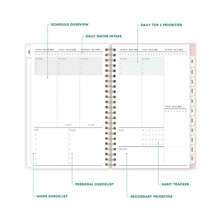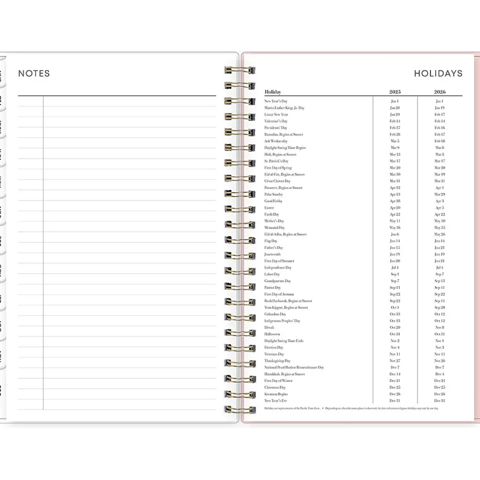 - Yearly overview, list of major holidays, and pages for your contacts, goals, important dates, and notes