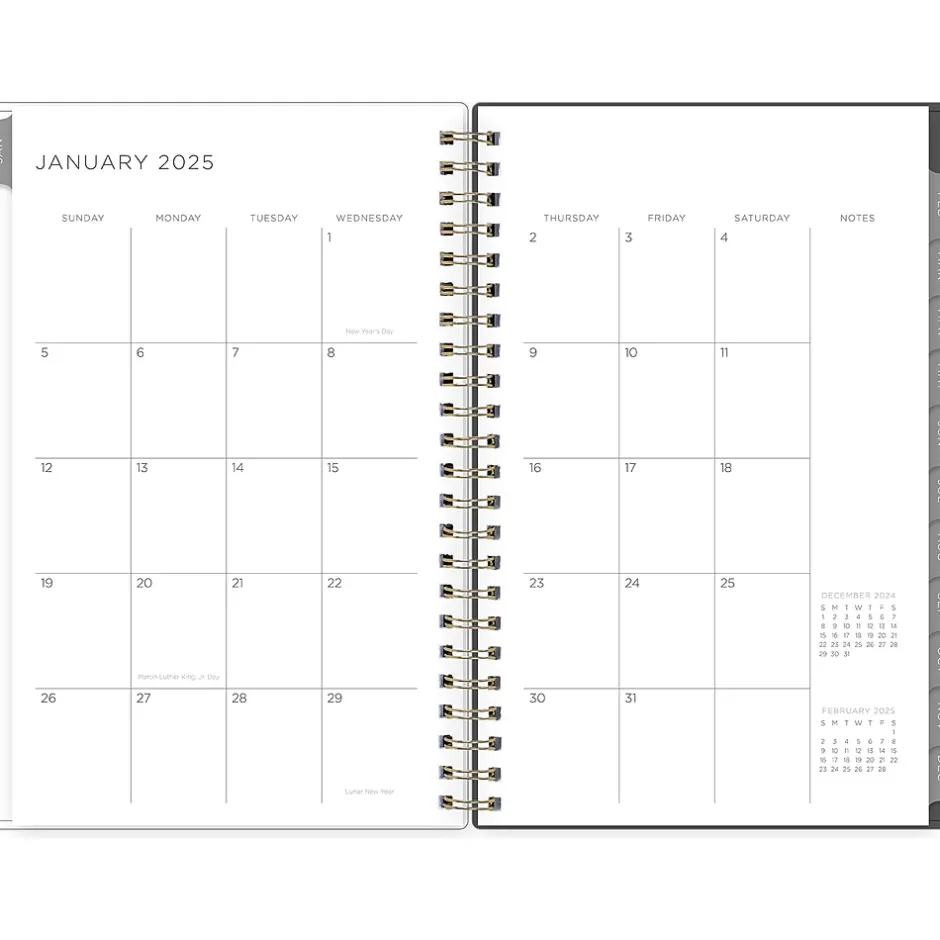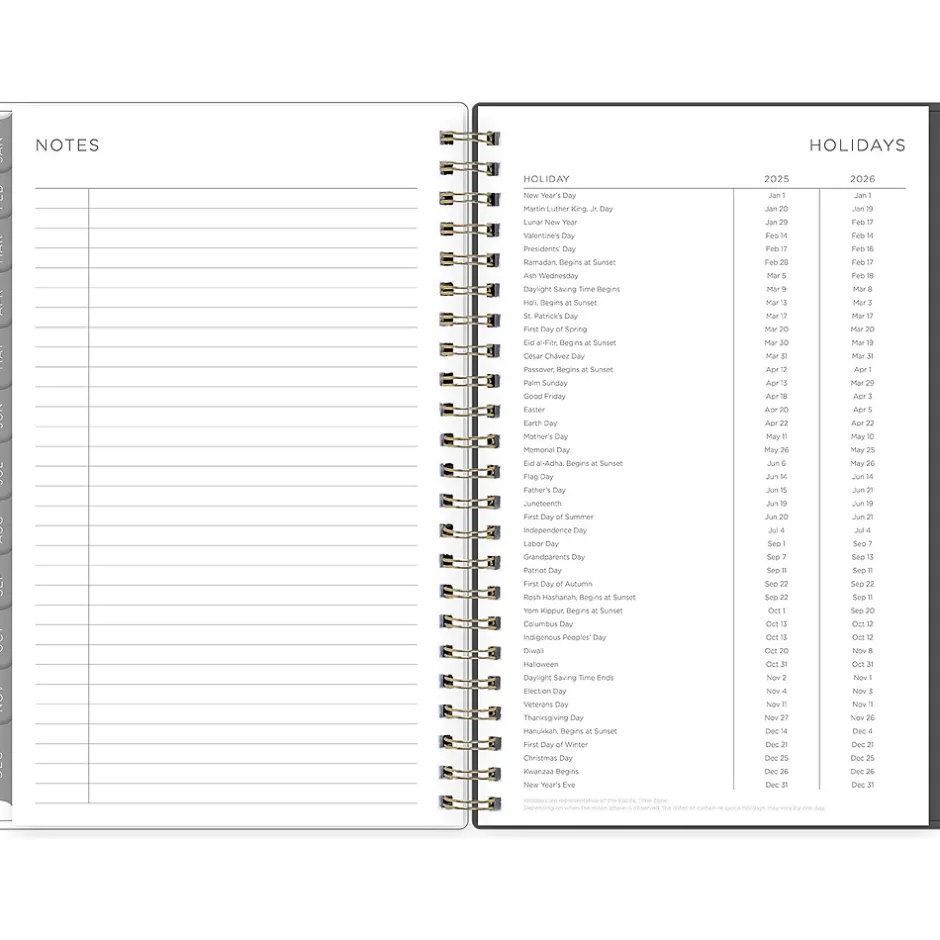 - Offers one month per two pages and one week per two pages with space for notes and quick reference calendars