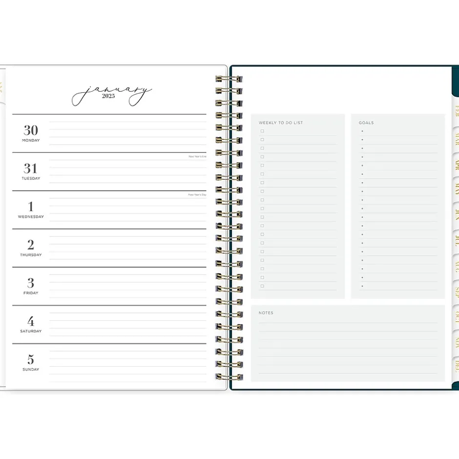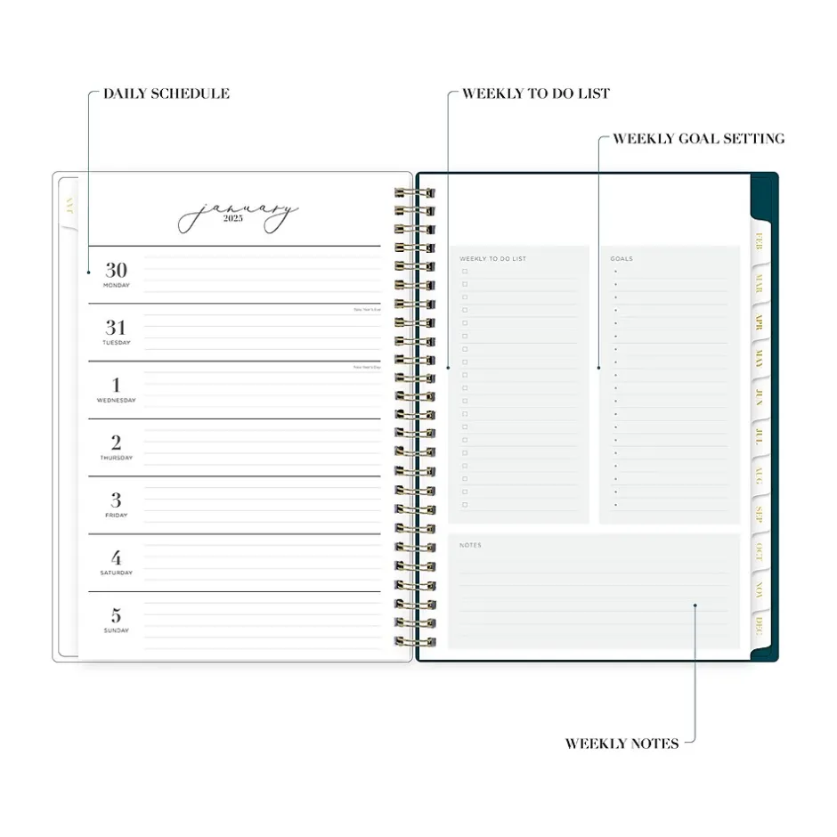- Offers goal-focused weekly layouts with the week on the left page and sections for notes, goals, and to-dos on the right; and one month per two pages, with space for notes and quick reference calendars