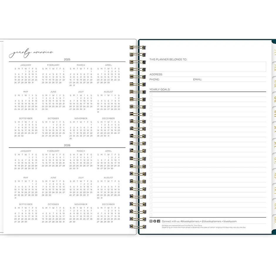 - Storage pocket, yearly overview, goals, contacts, and important dates