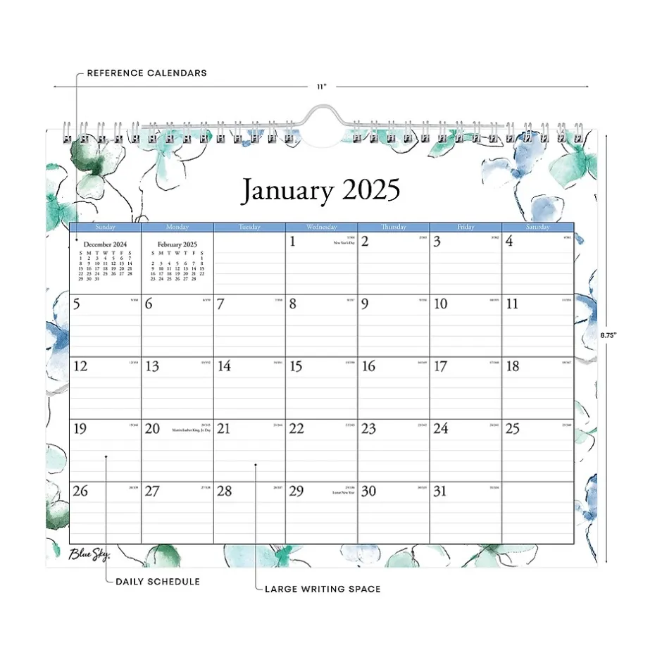Made for 2025, the Blue Sky Day Designer Lindley wall calendar accentuates any room. Easy to read with a large font, this calendar is a perfect tool to track deadlines and birthdays. Enjoy high-quality white paper, large text, and hassle-free hanging with a sturdy hook.