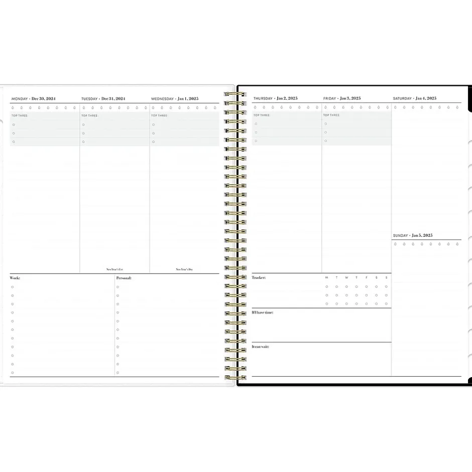 - Two-page vertical weekly spreads with sections for daily priorities, a habit tracker, and more; monthly spreads with spacious unruled daily blocks, space for notes, and quick reference calendars