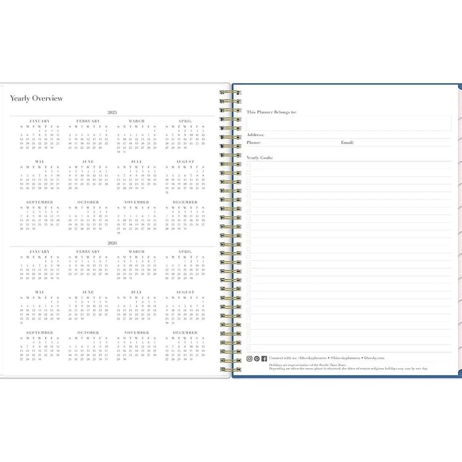 - Yearly overview, list of major holidays, and pages for your contacts, goals, important dates, and notes