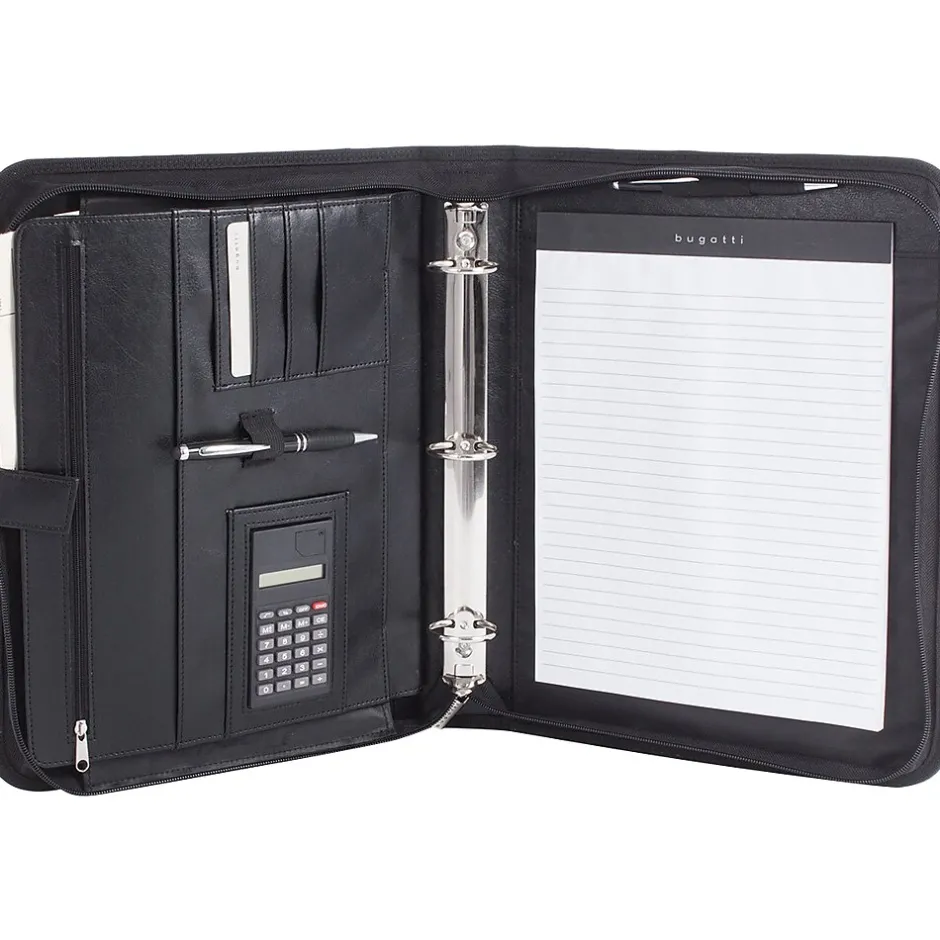 - Features a built-in organizer and a roomy document section, 2″ ring binder, slots for notes and business cards, calculator pocket, and pen loop
