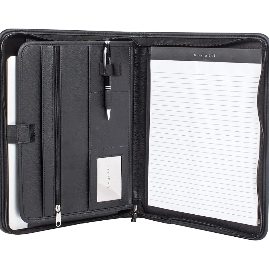 Bond Street vegan leather writing case is the perfect business accessory when you have to leave your desk. Stay organized with this stylish Bugatti padfolio. It has slots for notes and business cards, a zipper section, and a secured tablet section. A letter-size notepad is included.