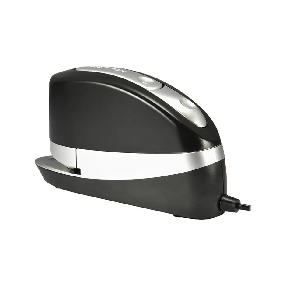Expand your stapling horizons with speed and style. This attractive electric stapler is packed with all the necessary features. Optical trip firing mechanism provides fast stapling and Anti-Jam floating core eliminates frustrating staple jams. Extra wide lead-in and adjustable paper stop ease the stapling experience and help place the staple exactly where needed. Will staple at normal right angle or at 45 degrees. Stapling tray holds an additional four strips of staples