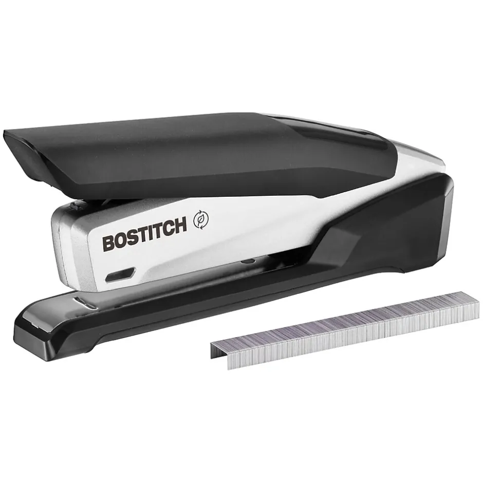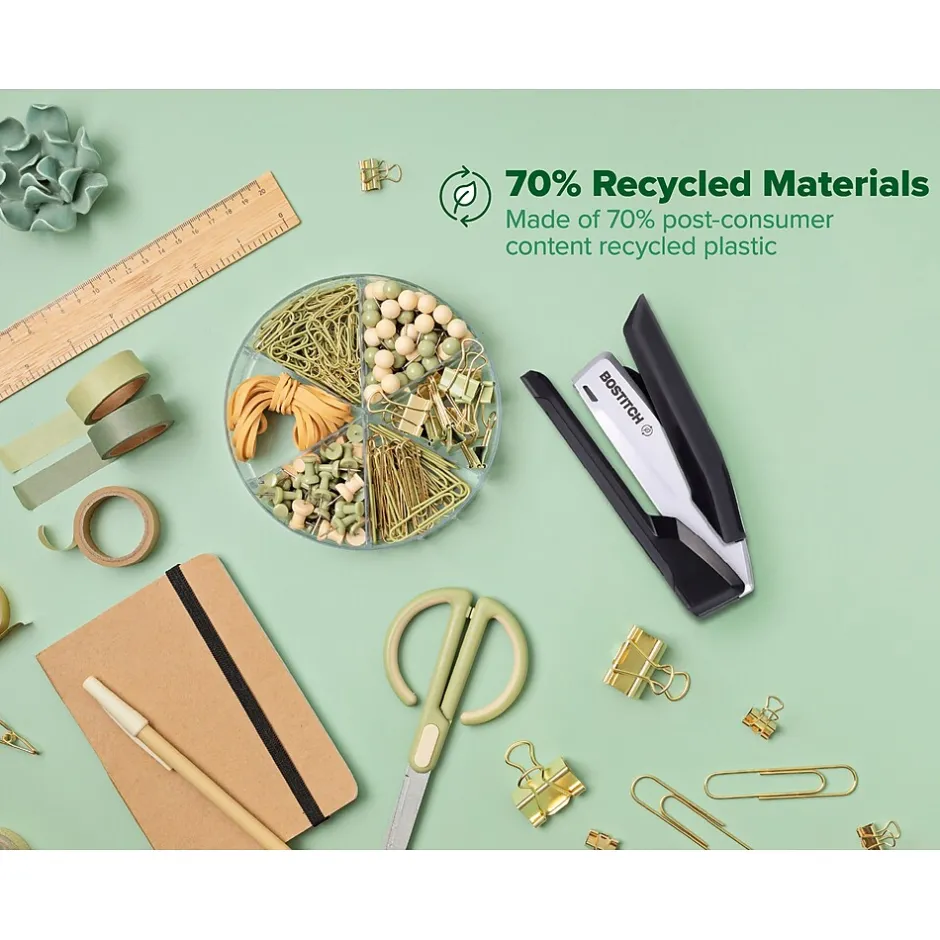 With One-Finger™ Stapling Technology by Bostitch Office, all it takes is a finger to get the job done. Our inPower™ eco-friendly stapler boasts a long-lasting sleek, die-cast metal body that provides the eye candy your desk craves, all while being eco-friendly with a construction made from 70% post-consumer recycled plastic. The easy stapling of up to 28 sheets, along with the ergonomic non-slip comfort grip and base, provide the luxury you deserve. Using standard staples, it also works jam-free and opens for bulletin board tacking. Perfect for home, school, or the office – experience a better way to staple while making a positive impact on the environment