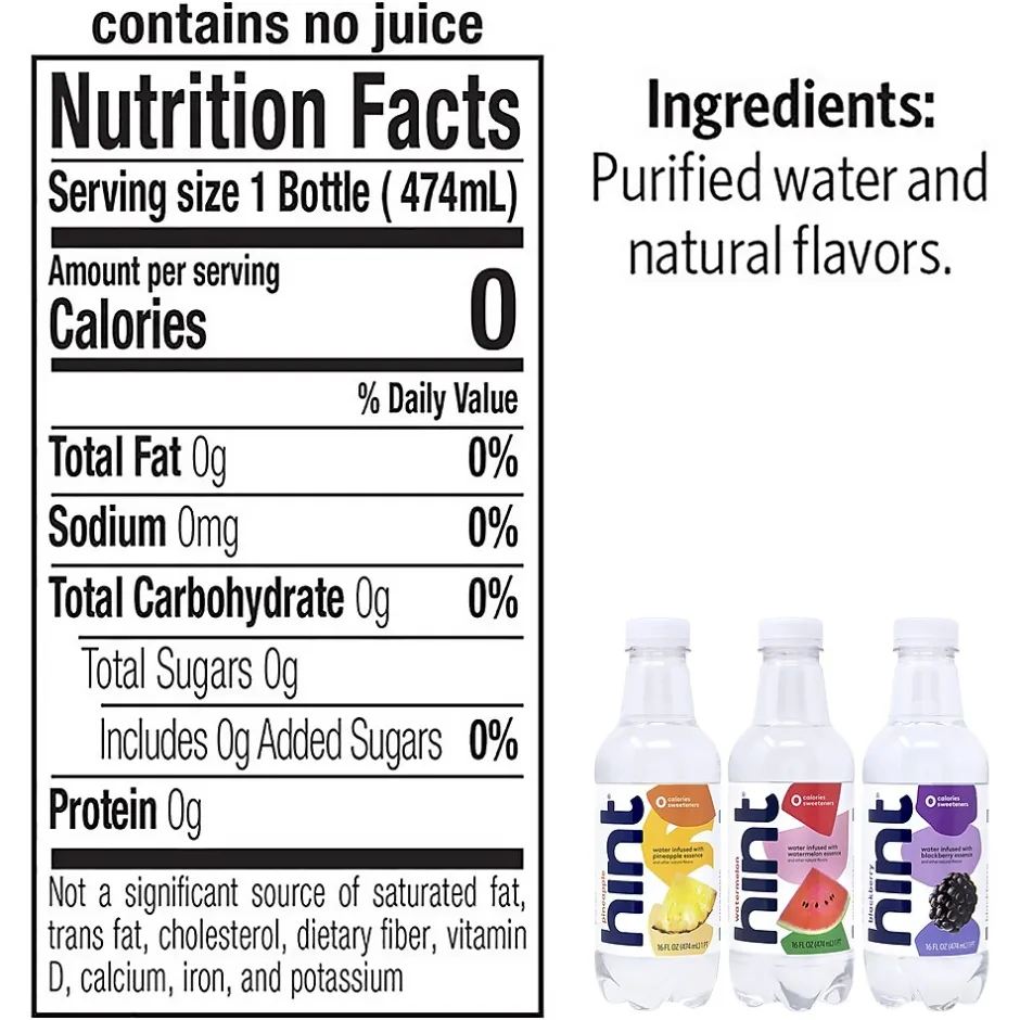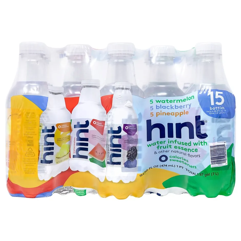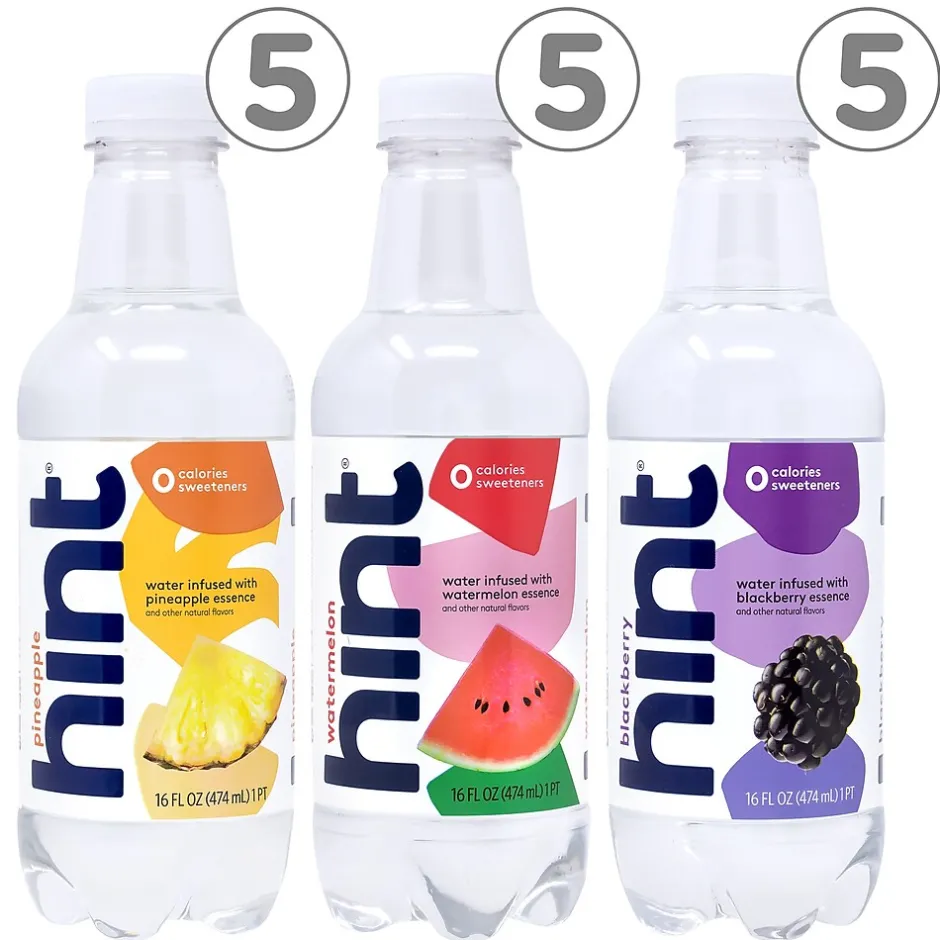 - Includes five Hint Watermelon 16oz., five Hint Blackberry 16oz., and five Hint Pineapple 16oz
