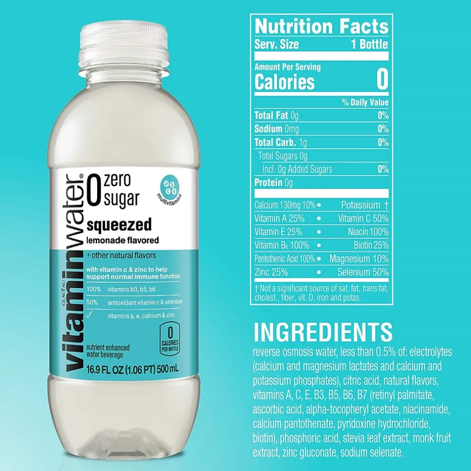 Savor the flavor of summer year-round with squeezed lemonade enhanced water while replenishing your electrolytes. Glaceau vitaminwater zero squeezed lemonade provides 100 percent of vitamins B5, B6 and B12 for a nutrient boost.