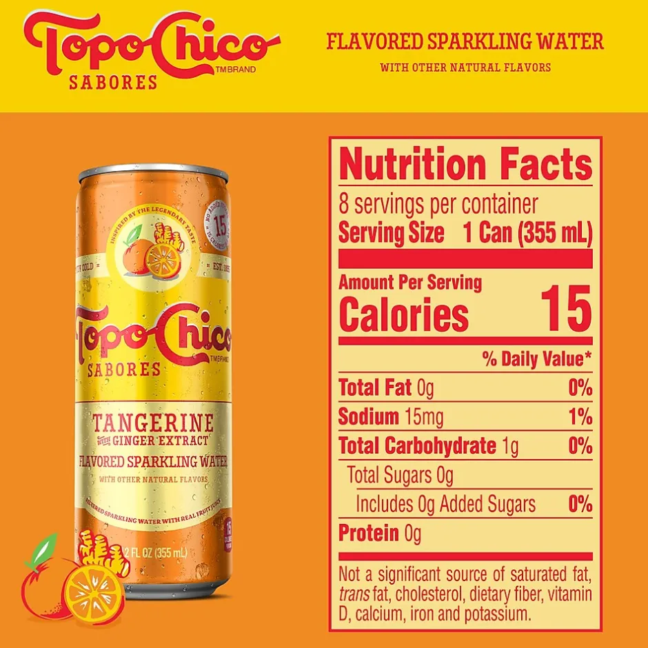 Topo Chico Sabores Tangerine Ginger Sparkling Water has real Fruit Juice with a Hint of Herbal Extracts, paired with the signature minerality & exceptional effervescence for an elevated taste on a healthier indulgence.Enjoy Topo Chico Sabores on its own, as a cocktail mixer, or pair it with your favorite dishes. Elevate your dining and hydration experience with every bubbly sip!
