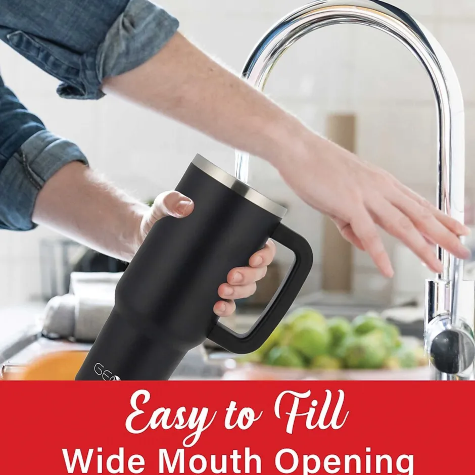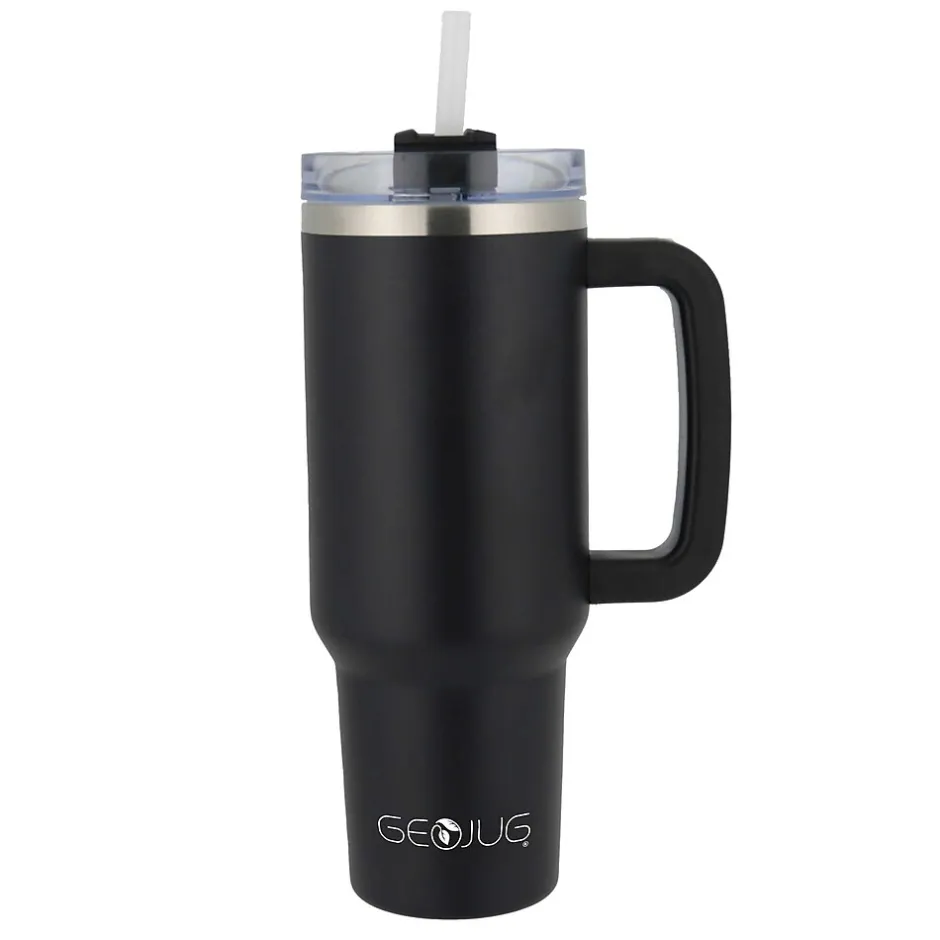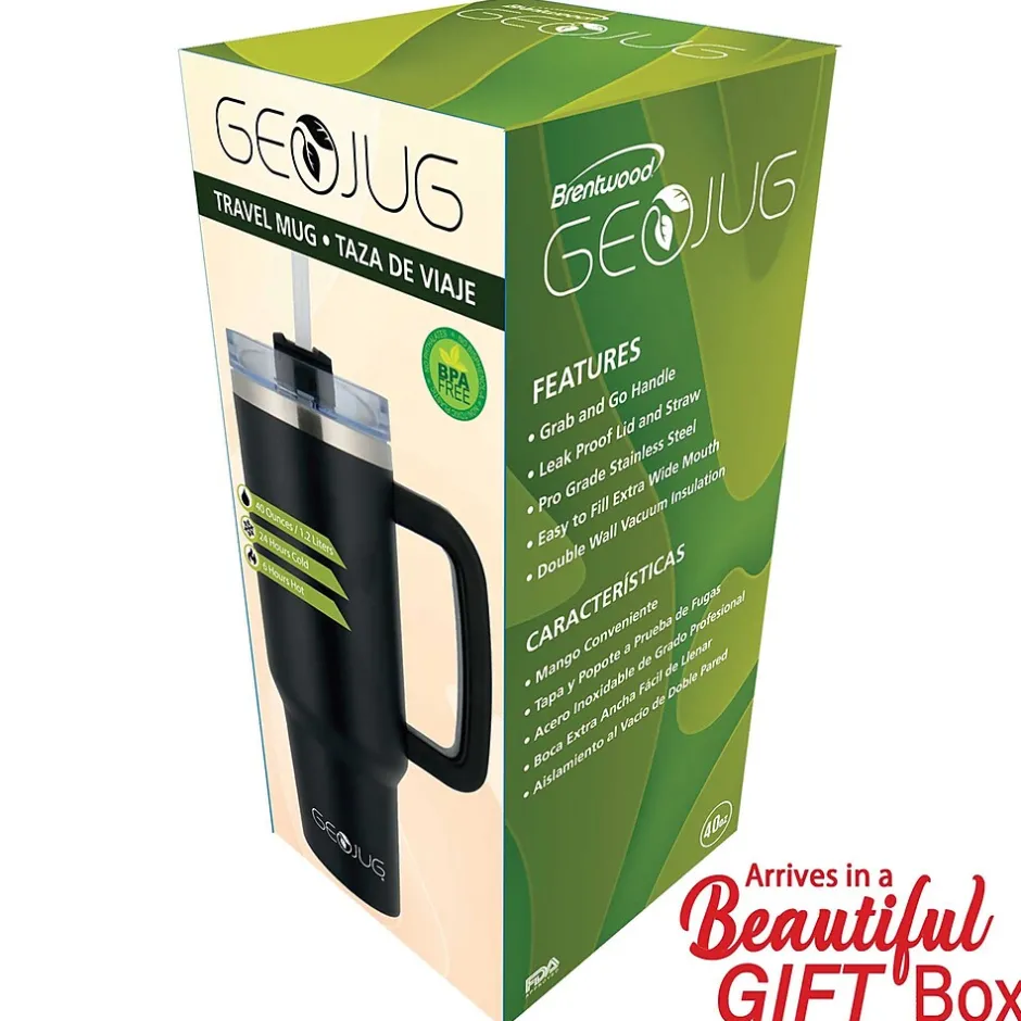 The Brentwood® Geojug 40-Oz. Insulated Stainless Steel Tumbler Cup with Handle, Lid, and Straw quenches your thirst on the go. Conveniently take your favorite drinks anywhere and everywhere with the integrated comfort handle. The leak-resistant lid keeps spills away while the straw provides endless sipping comfort. The smartly designed travel mug fits in all kinds of cup-holders so you’re always in arms-reach of your drink. Stainless steel double-wall vacuum insulation keeps your beverages super hot or ice cold for hours and never sweats. Tasteless and odorless, pro-grade stainless steel is highly durable and super-easy to clean.