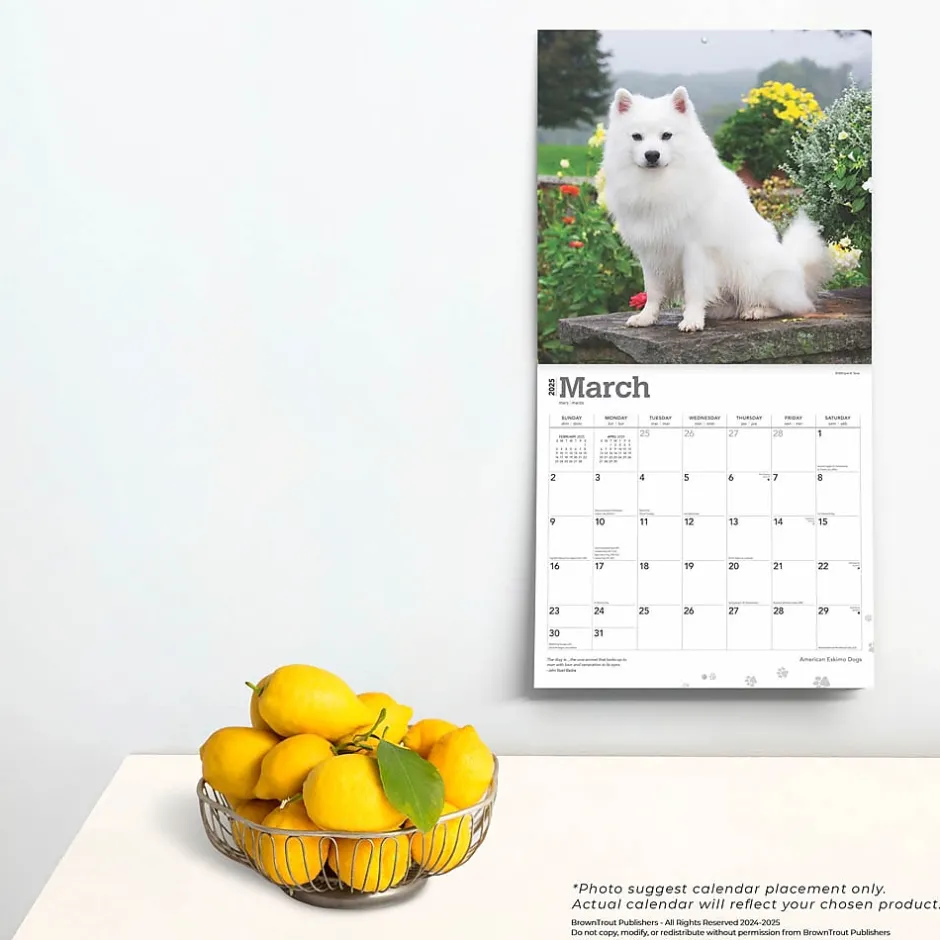Unrelated to the working sled dogs and possessing a beautiful snow-white coat, American Eskimo Dogs are highly intelligent, alert, and friendly. The Barnum & Bailey Circus popularized this breed throughout the United States when an “eskie” named Pal Pierre was the first dog ever to walk a tightrope. The breed was officially recognized by the AKC in July 1995. This calendar presents a collection of American Eskimo dogs, both puppies and adults.