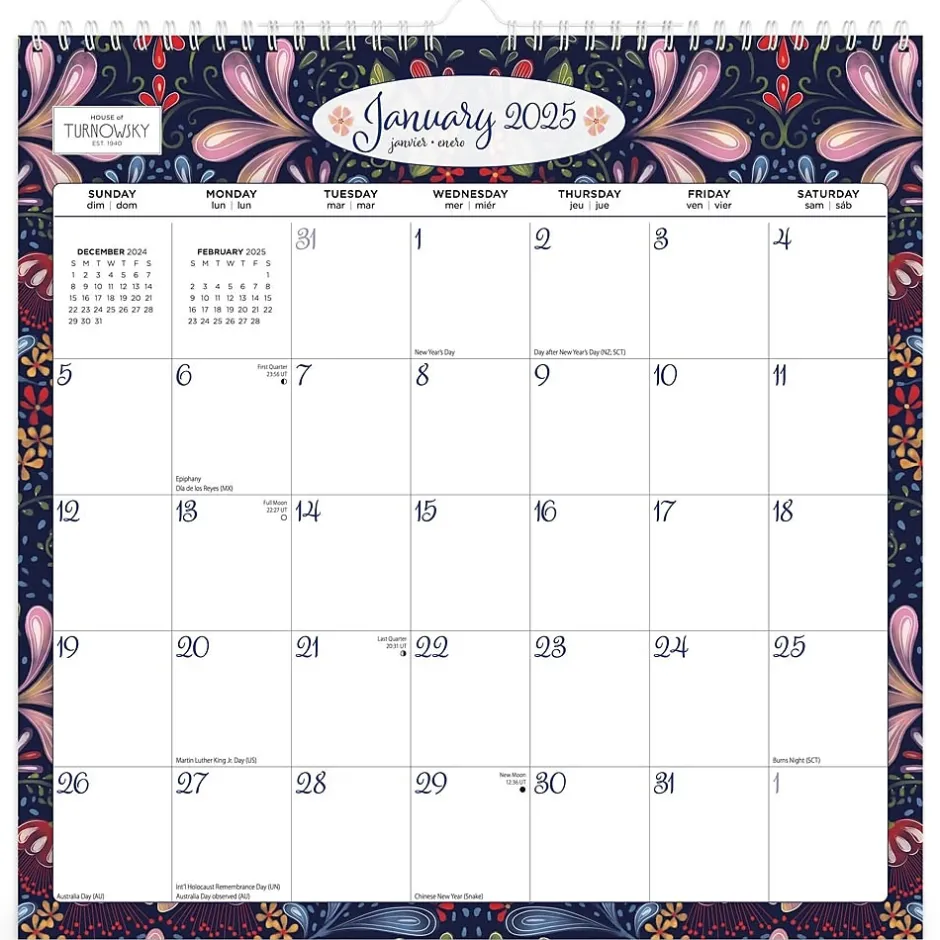 - Large, Roomy Day Blocks – All major holidays and moon phases listed, with plenty of room for writing notes and appointments