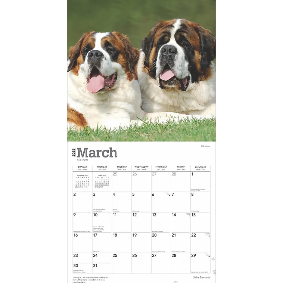 The Saint Bernard is a tough working dog originally used as a rescue dog in the Swiss Alps. The spirits carried around its neck provided the rescued with warmth to combat the cold temperatures. This big dog is also known for its loyalty, love, and gentleness. Saint Bernards (the Swiss call them “Barry” dogs) are great with children, and make wonderful family pets. This calendar is devoted to the huge, huggable Saint Bernard.