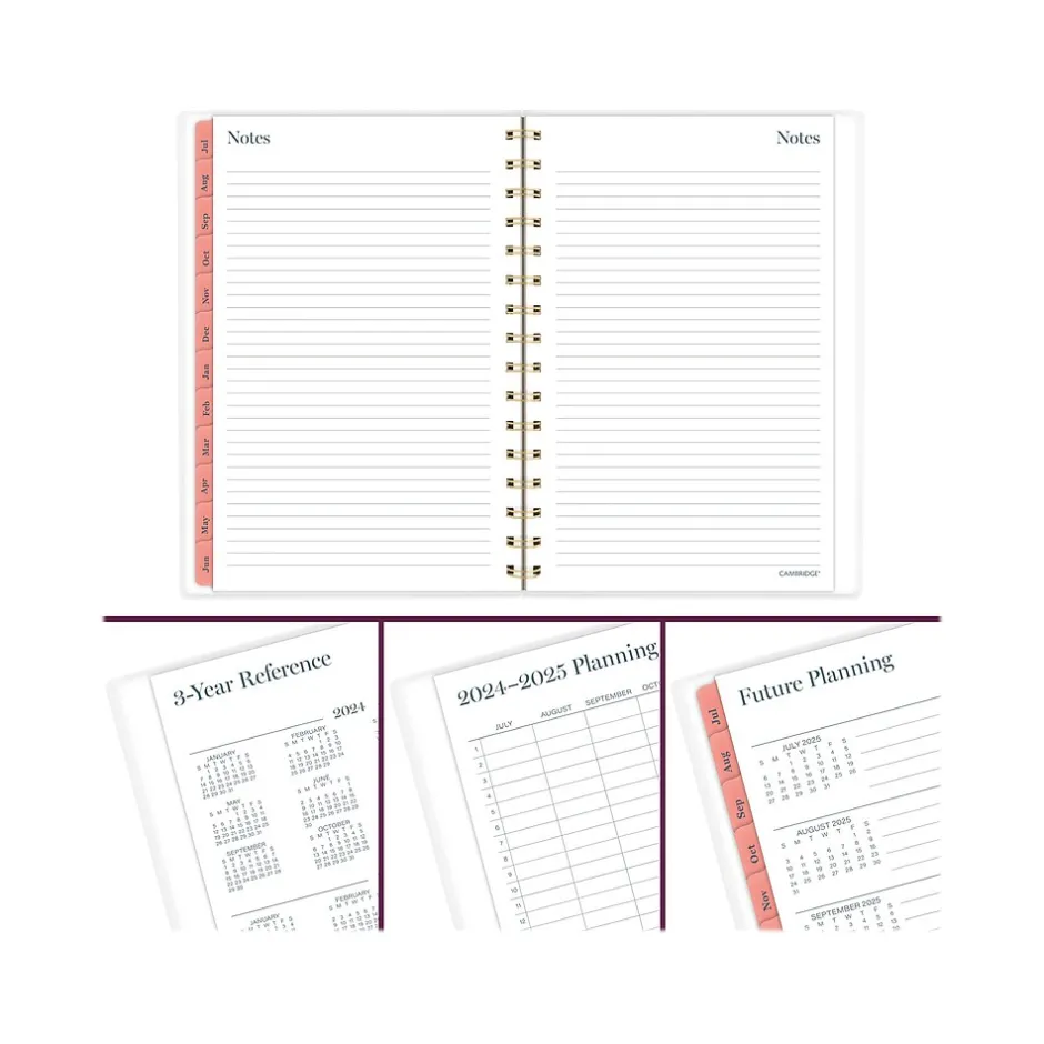 - One month per view, one week per view, holiday list, academic year, three-year reference calendar, motivational quotes, and five note-taking pages