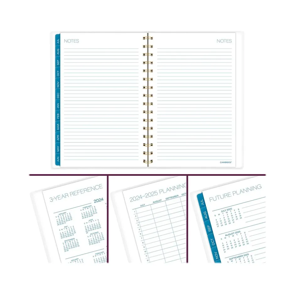 - One month per view, one week per view, to-do section, three-year reference calendar, five note-taking pages, notes, and holiday list