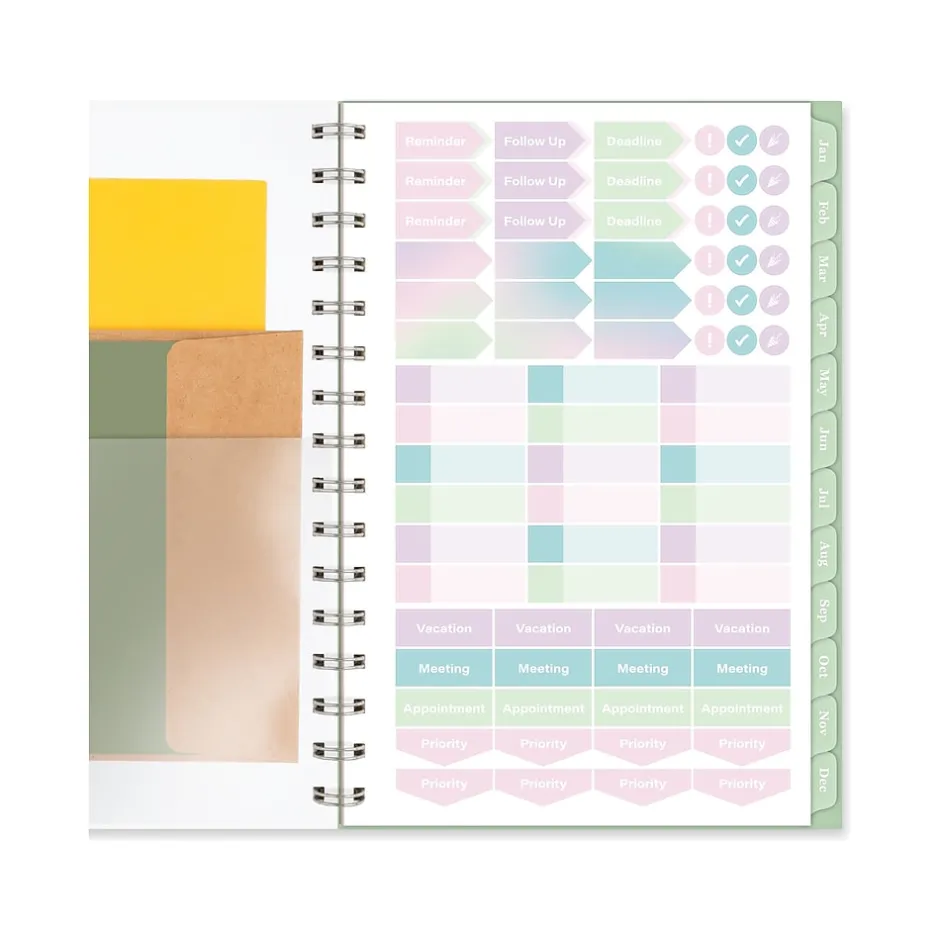 - Special pages include a double-sided poly pocket, three-year reference calendar, holiday list, two future planning pages, five note-taking pages, and a sticker sheet