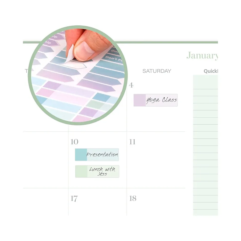 - Special features include a double-sided poly pocket, three-year reference calendar, holiday list, two future planning pages, five note-taking pages, and a sticker sheet