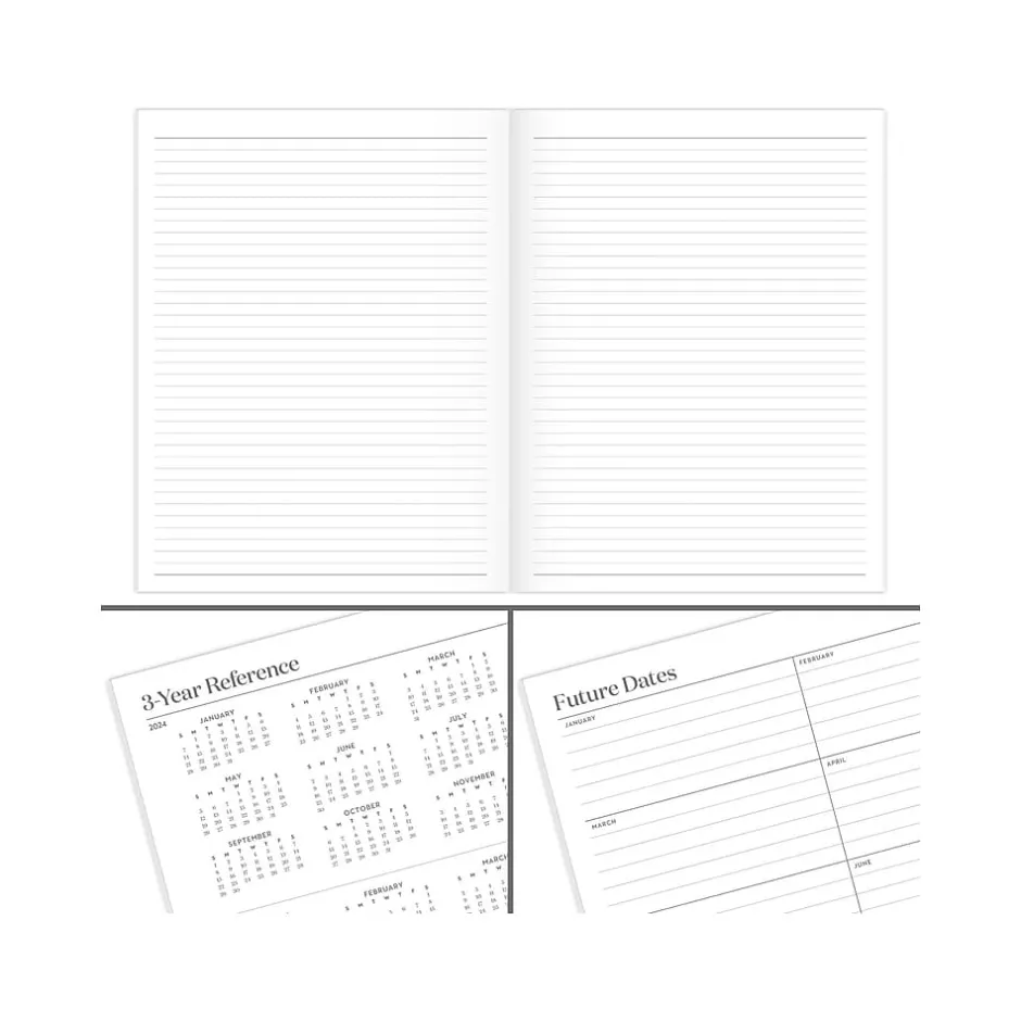 - Special pages include a 3-year reference calendar, goals, 18 note-taking pages, future dates, and a holiday list