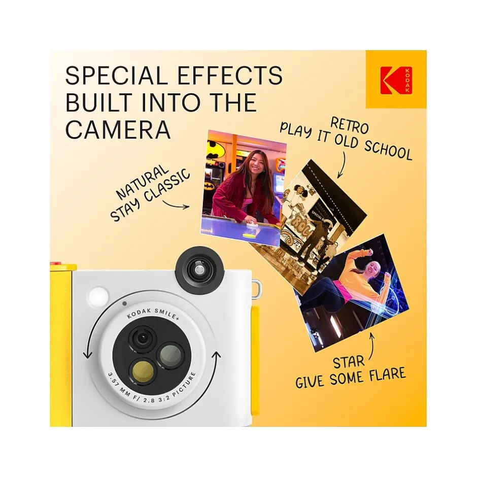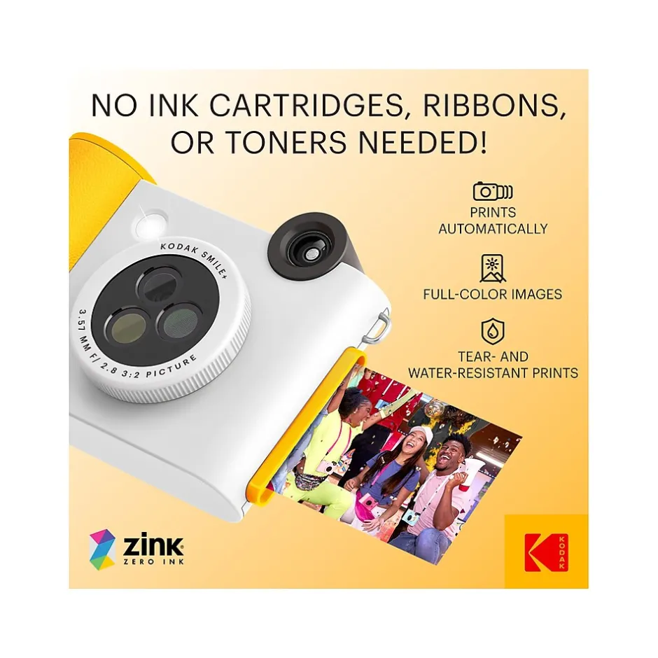 Make taking photos fun again with the Kodak Smile+ digital instant print camera. With this easy-to-use, enjoyable device, the smiles will never disappear. Take this rechargeable camera with you anywhere you go so you can take memory photos at the park, on vacation, during parties, on a road trip, and so on. And with the integrated filter-changing lens, taking new pictures never gets old. Add new spice and thrills to the photos you take by switching to a new filter in a second. With this fun-having camera, pictures stand out more than ever before. And since this camera is compatible with ZINK photo paper, you don’t need to worry about buying ink. Take a photo and watch your wonderful image print out on ink-free, sticky-backed paper. The Smile+ gives you a reason to put a smile on.