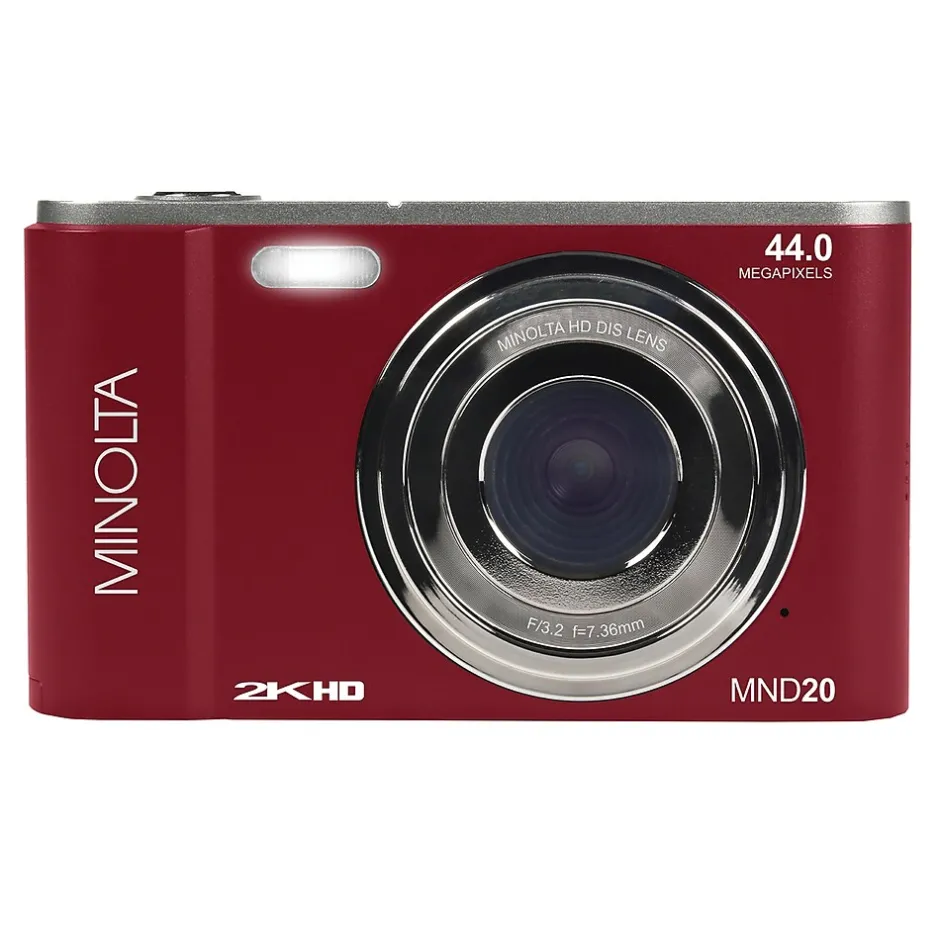 Preserve the moment with Minolta’s Red MND20 Digital Camera and its high-resolution photos that are suitable for cropping or enlarging thanks to the 44 MP photo resolution. And its 2.7K Quad HD video gives your video greater vividness and clarity than standard-definition video. Featuring a compact size with anti-shake stabilization, you can easily compose shots and review photos with the 2.9-in. LCD monitor. Capture close-up details or shoot from a distance with the 16x digital zoom lens. Intelligent scene modes and features like smile capture and photo burst make shooting the ideal shot easy and fun.