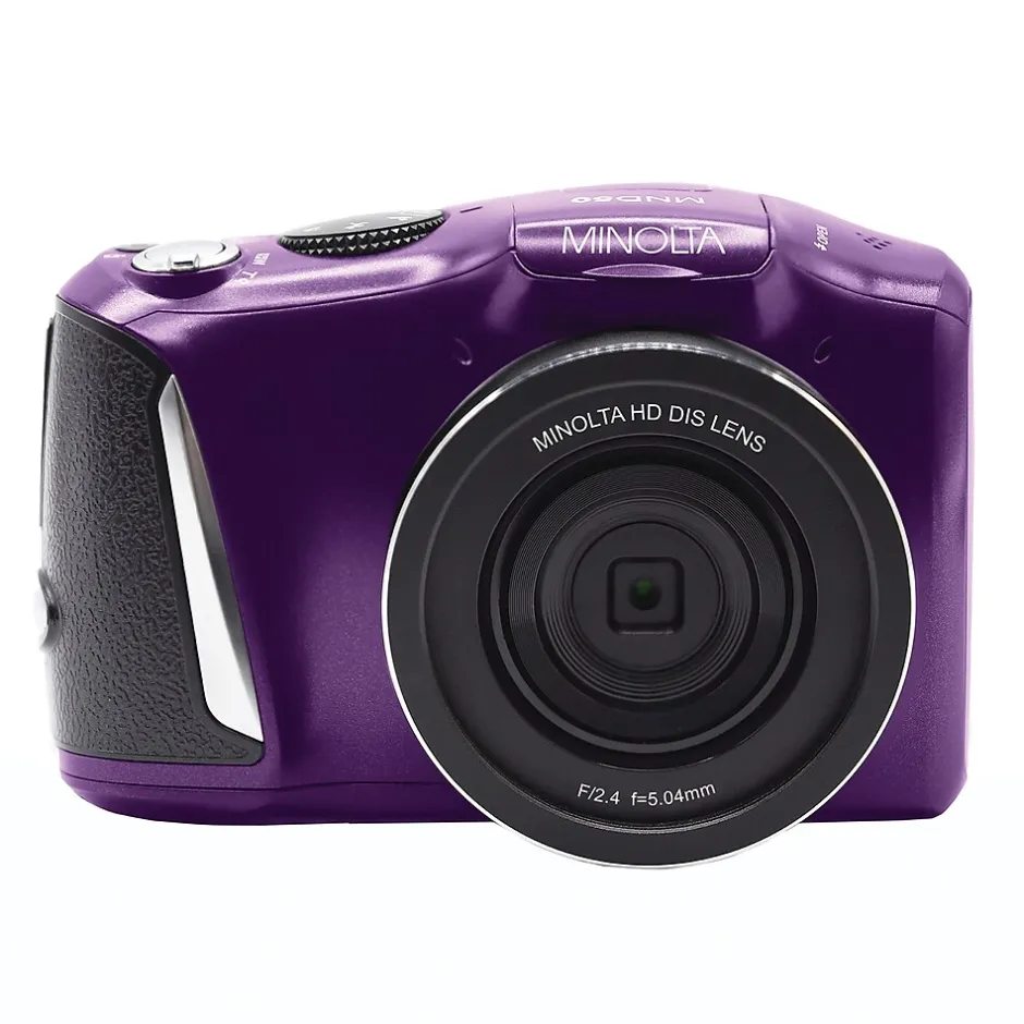 The Purple MND50 from Minolta is a robust digital camera with high-end features packed into a point-and-shoot package. Capture 48 MP photos and 4K Ultra HD video with ease using the 16x digital zoom lens and 3-in. IPS LCD monitor. Rotate the mode dial to enable the ideal settings for any scene and shoot closeups in vivid detail and clear focus using the macro mode with ISO 6400.