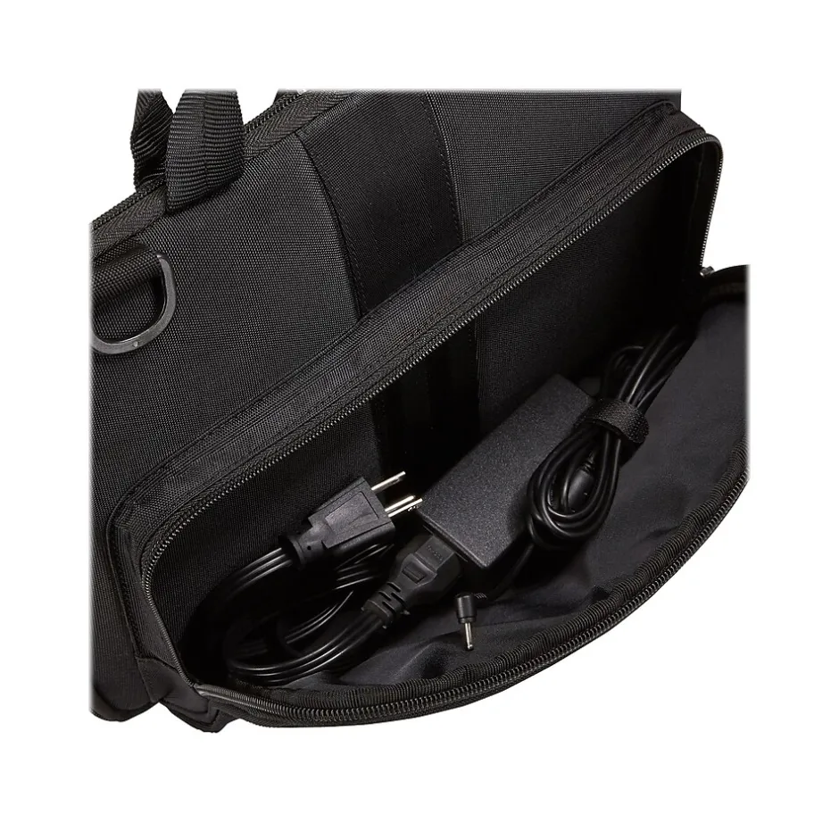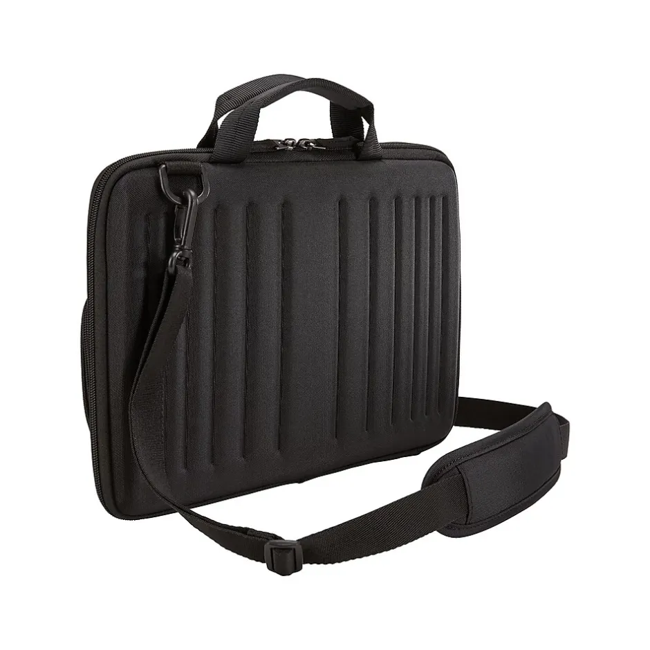 The Case Logic hardshell laptop work-in case features protective thick padding, molded ridges for airflow, and accessory storage. The slim molded EVA work-in case fits Chromebooks with screens up to 11.6″. Padded handles and removable padded shoulder strap provide multiple carry options. An accessory pocket stores cords and other small daily items. Thick, quilted padding keeps the device protected and securely in place. Clamshell design and molded airflow channels allow for in-case use. Elastic corner loops keep most 11.6″ Chromebooks/laptops anchored in place. Features a clear ID slot on the exterior for easy identification.