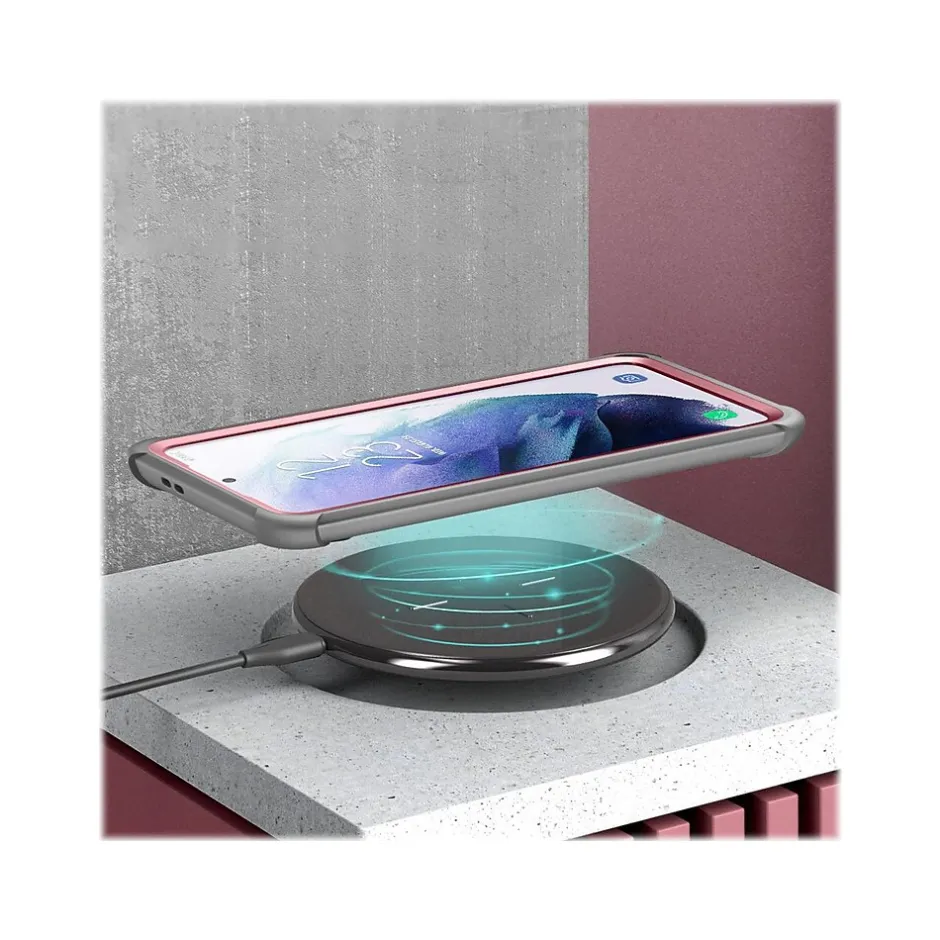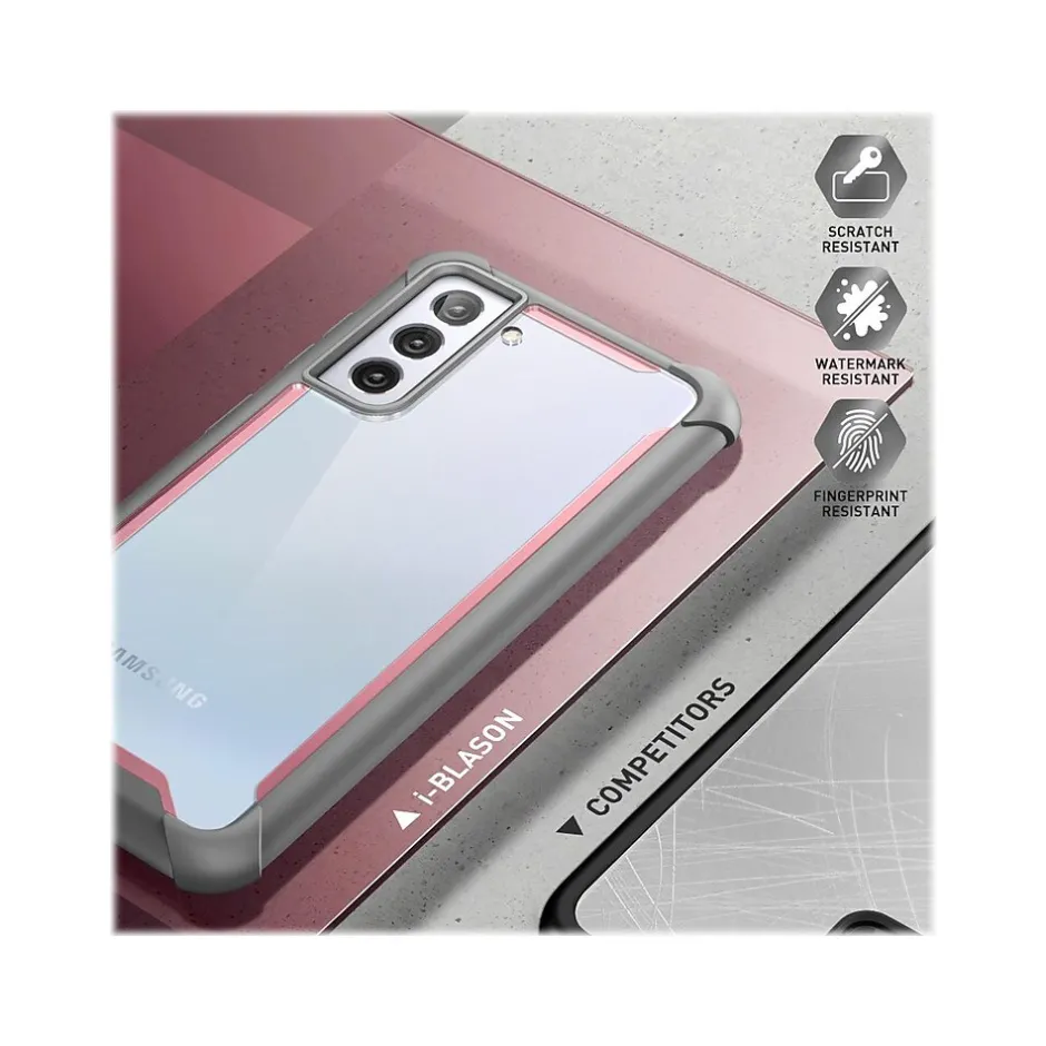 This i-Blason Ares pink rugged case offers full-body protection against dust, dirt, and drops for your Samsung Galaxy S21 Plus. It features impact-resistant bumpers and port covers and is compatible with wireless charging.
