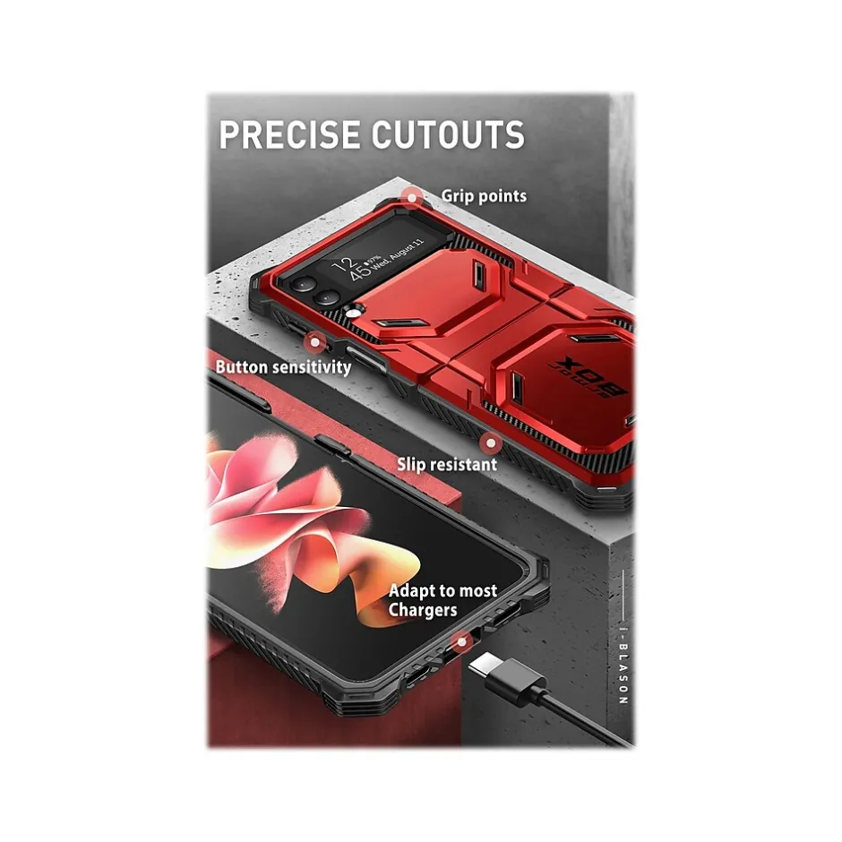 The i-Blason Armorbox rugged case ensures 360-degree full-body protection for your Samsung Galaxy Z Flip4 5G (2022). Precise cutouts allow seamless access to all ports and features. Exceeds military drop standards: drop-tested at 48″ height, 26 times.
