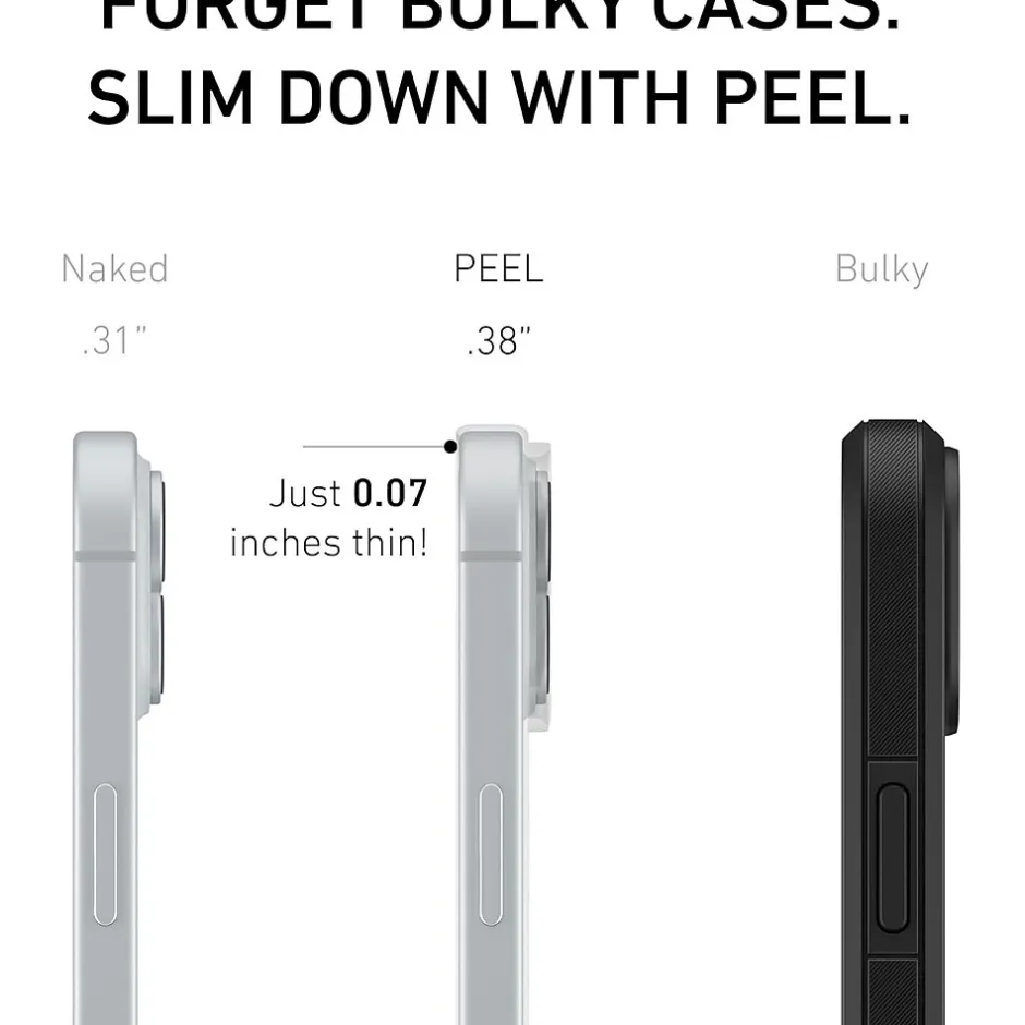 The thin, magnetic iPhone 15 Plus case is designed to keep the original look and feel of your phone while protecting it and allowing for Magnetic charging. Features an impact-resistant polycarbonate back for enhanced protection, TPU sidewalls for shock absorption, and a comfortable grip. Ditch the bulk and slim down with Peel.
