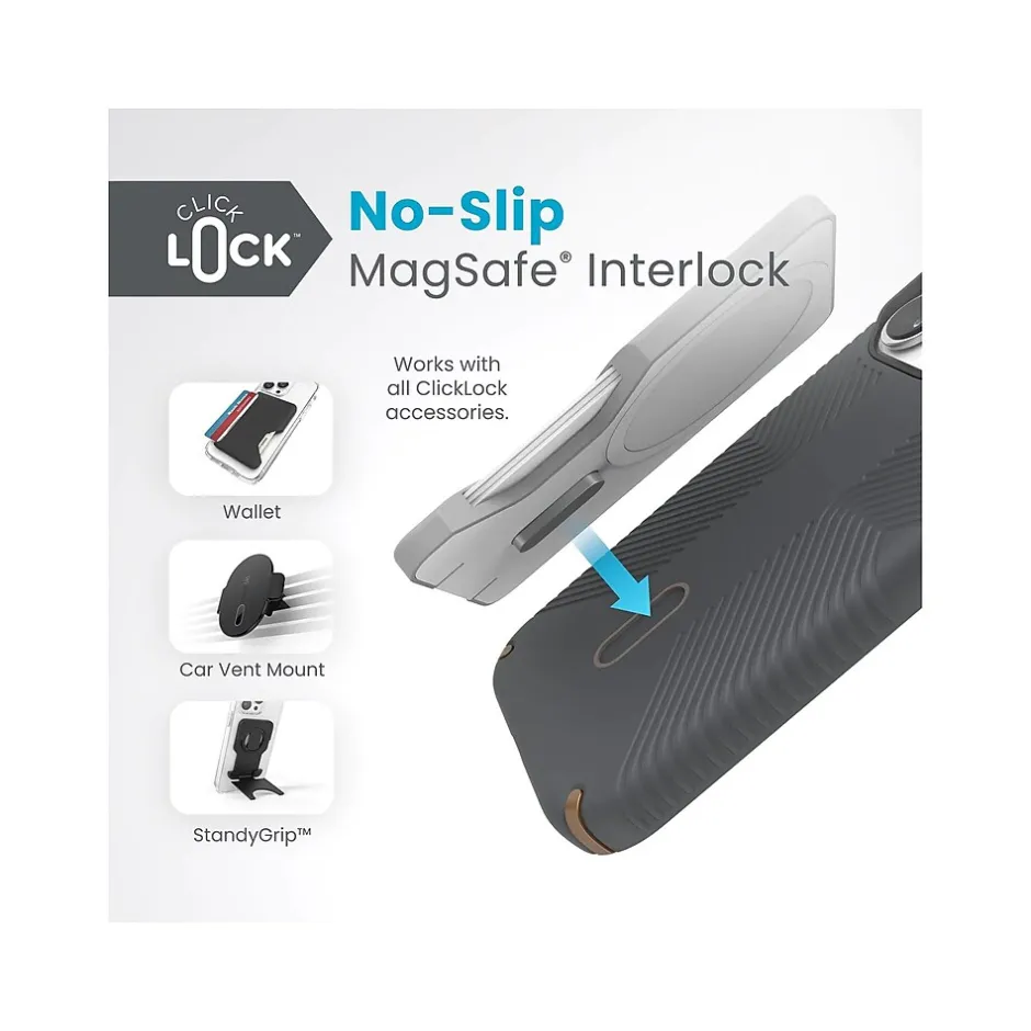 - ClickLock no-slip interlock technology has a bolt that locks accessories onto your phone or your phone into place, creating less friction and therefore less chance of slippage