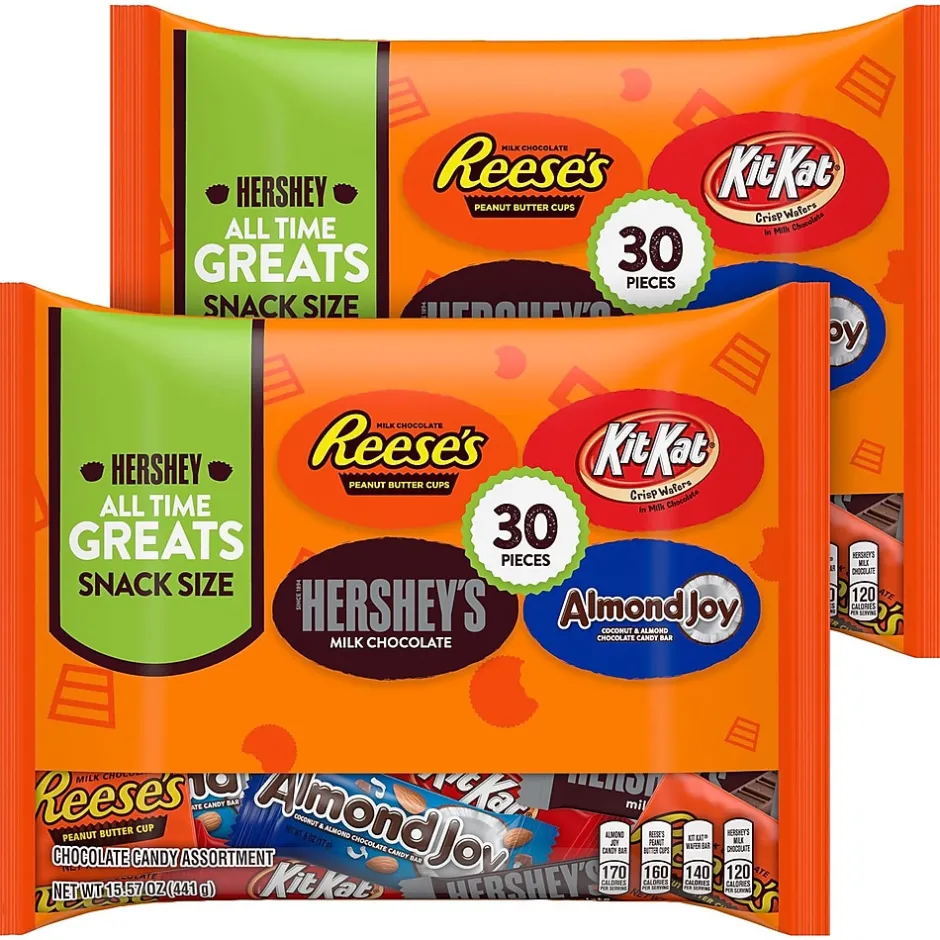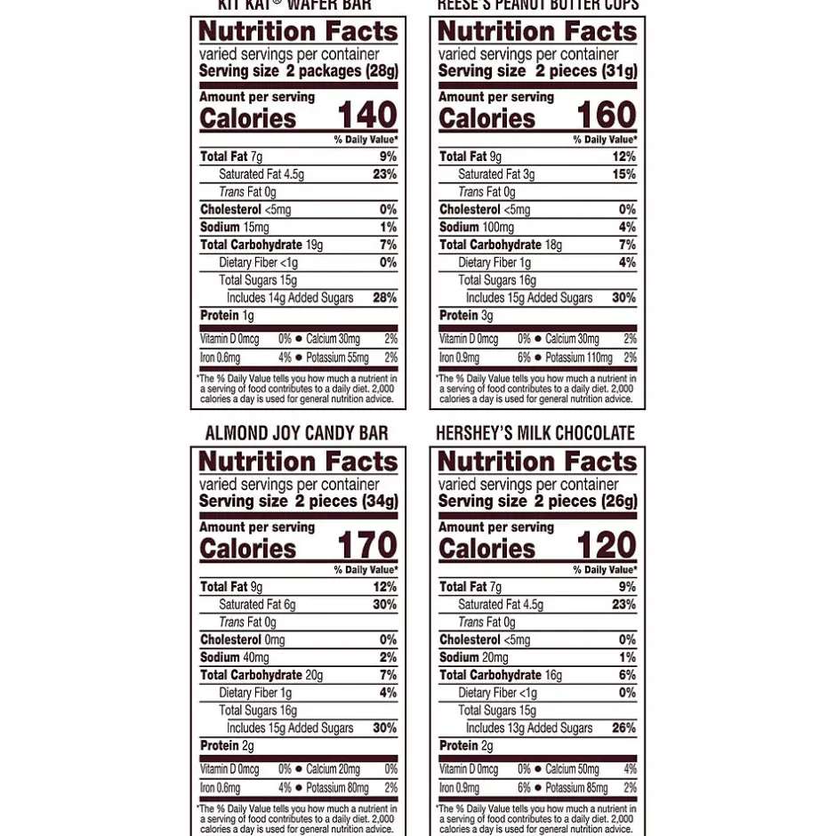 - Includes snack size Hershey’s Milk Chocolate Bars, Almond Joy Candy Bars, Kit Kat Wafer Bars, and Reese’s Peanut Butter Cups