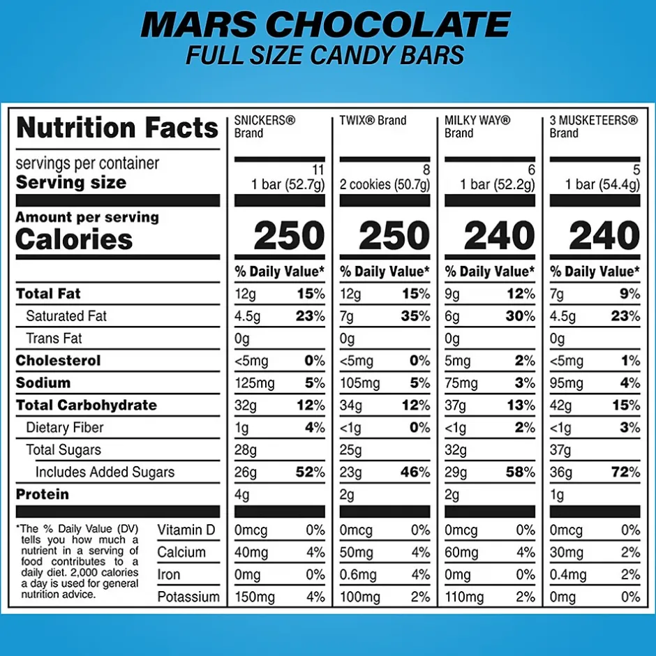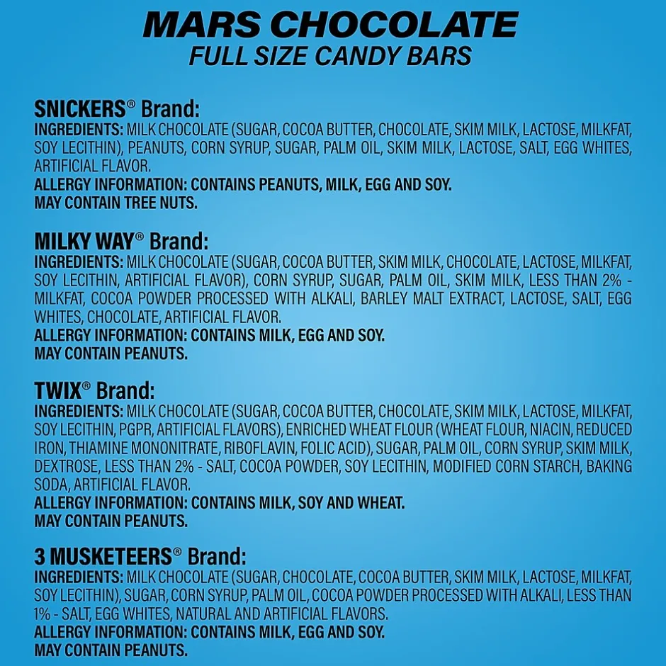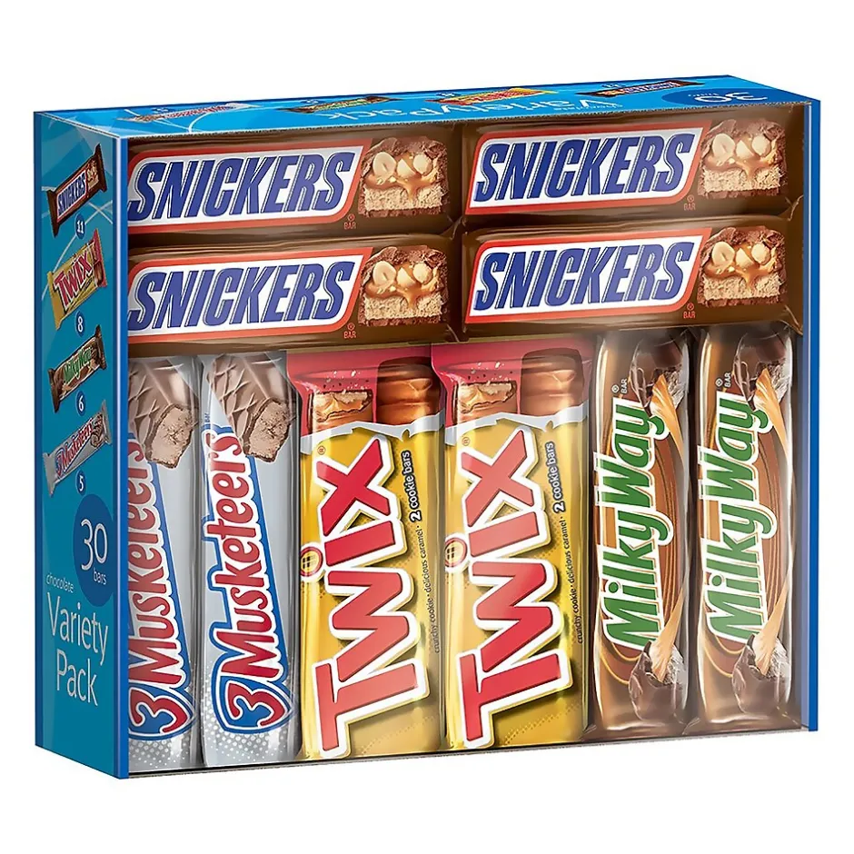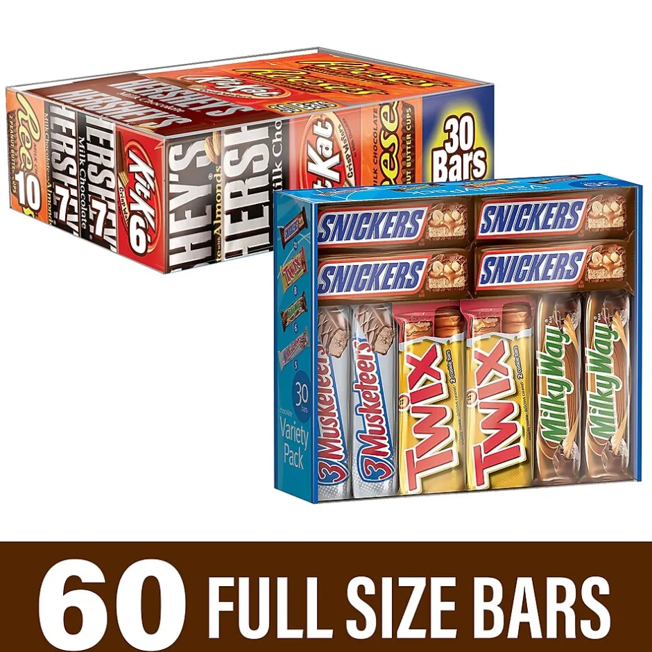 - Hershey Chocolate Full Size Variety Pack (KIT KAT Wafer Bars, REESE’S Peanut Butter Cups, HERSHEY’S Milk Chocolate Bars, and HERSHEY’S Milk Chocolate with Almonds Bars), 45 oz, 30 Count and MARS Chocolate Full Size Candy Bars Assorted Variety Box (SNICKERS, TWIX, MILKY WAY and 3 MUSKETEERS Chocolate Candy Bars) 55 oz, 30 Count
