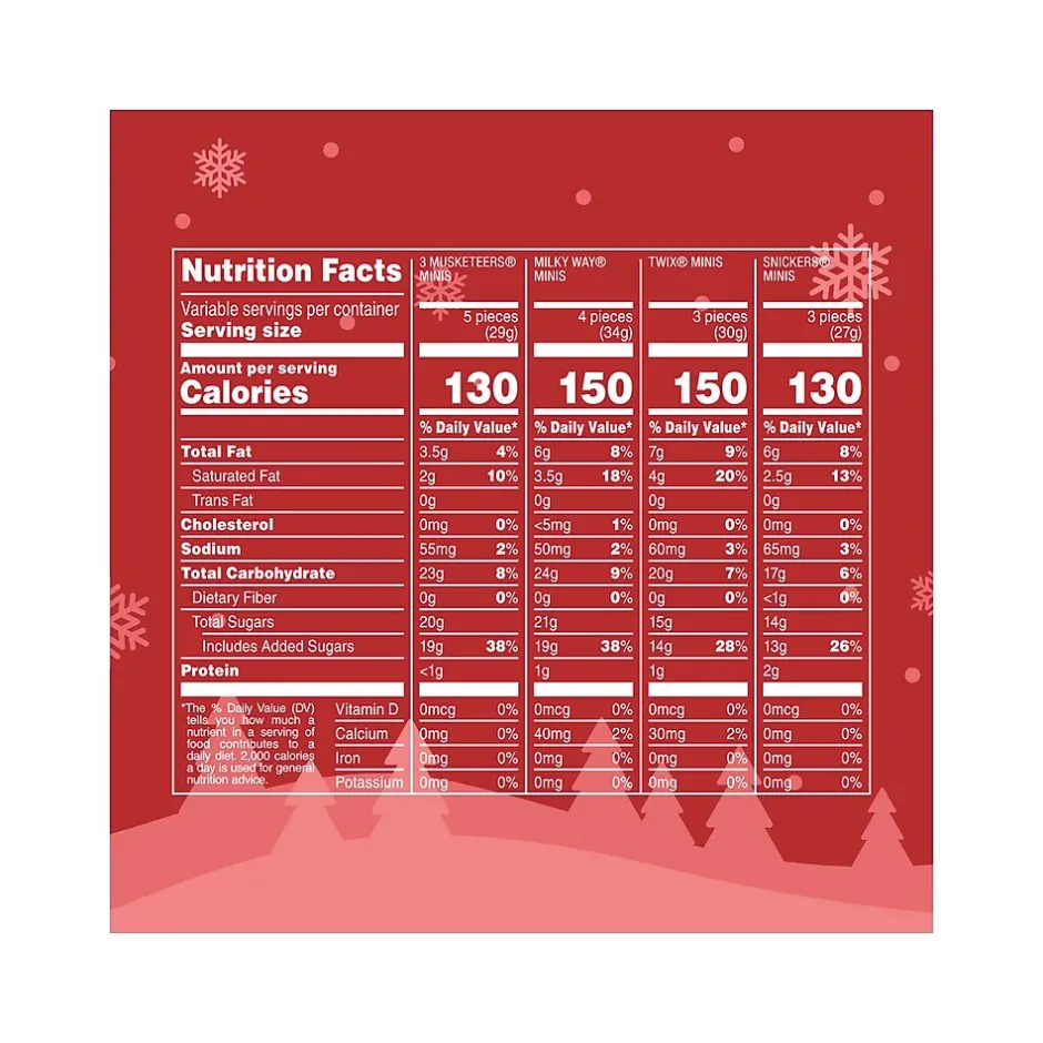 - Includes Snickers, Twix, Milky Way, and Three Musketeers minis