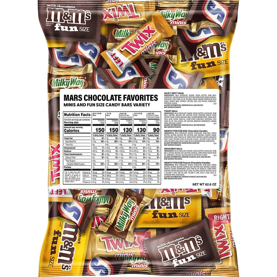 - Contains one (1) 62.6-ounce bulk bag filled with fun size and mini SNICKERS, M&M’S, MILKY WAY and TWIX Chocolate Candy