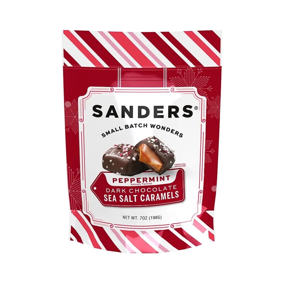 The Sanders holiday-exclusive Small Batch Wonders dark chocolate with peppermint caramel and crushed candy cane and sea salt sprinkled on top is made with real cream and butter. No artificial flavors, colors, or preservatives. Small-batch kettle-cooked caramel.