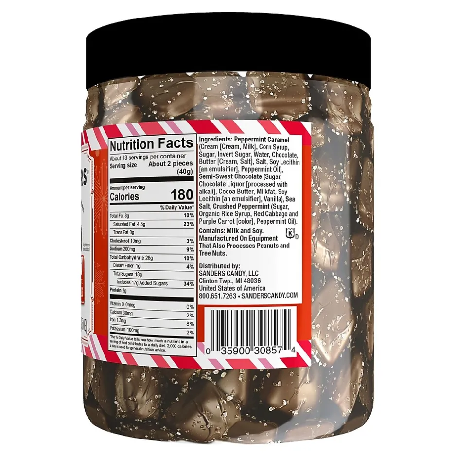 - Ingredients: peppermint caramel (cream (cream, milk), corn syrup, sugar, invert sugar, water, chocolate butter (cream, salt), salt, soy lecithin (an emulsifier), peppermint oil), semisweet chocolate (sugar, chocolate liquor (processed with alkali), cocoa butter, milk fat, soy lecithin (an emulsifier), vanilla), sea salt, crushed peppermint (sugar, organic rice syrup, red cabbage and purple carrot (color), peppermint oil