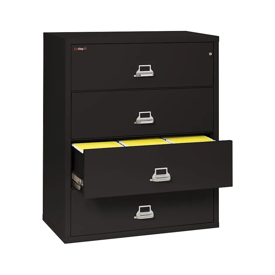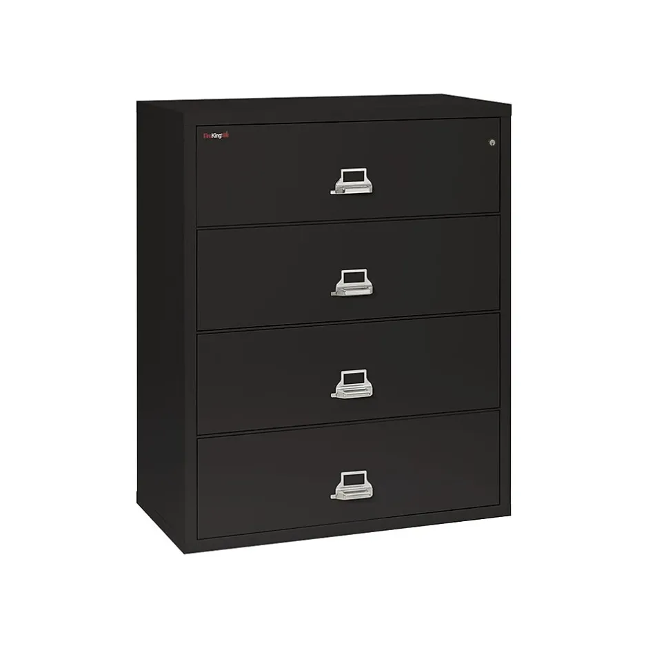 Store important paperwork in this FireKing lateral four-drawer fireproof file cabinet. The integrated lock prevents unauthorized access to sensitive documents, while the four spacious drawers maximize file storage space. A one-hour fire rating and water-resistant design defends your documents from damage during emergencies. This FireKing lateral four-drawer fireproof file cabinet boasts durable metal construction to withstand everyday wear and tear.